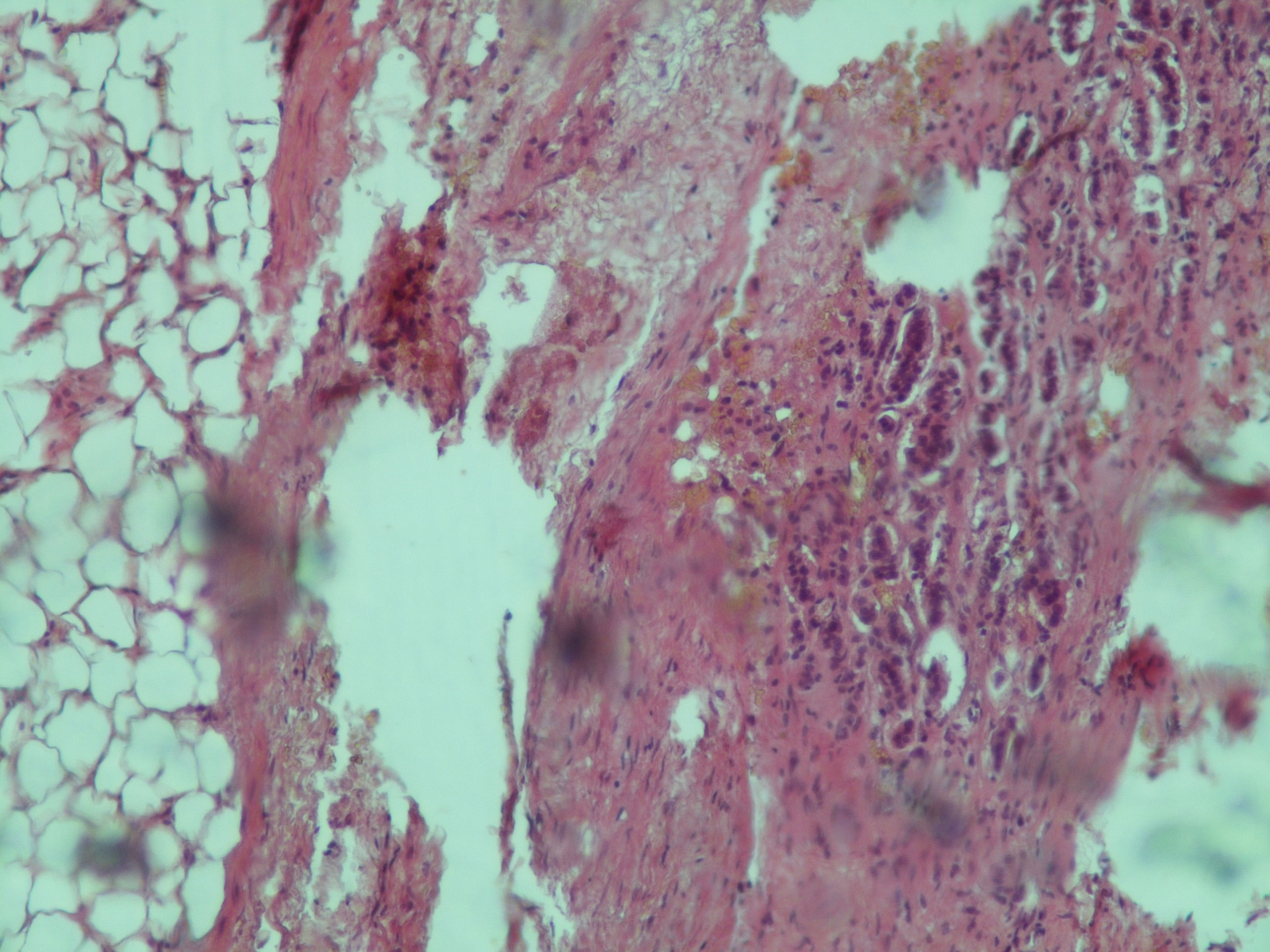 3. Рис. 3. Гистологическая картина удаленного образца надпочечника (окраска гематоксилином и эозином, ×120). Феохромоцитома злокачественная с умеренным инвазивным ростом в кору надпочечника (слева направо), сосуды, некрозы и перивазарная воспалительная инфильтрация. | |