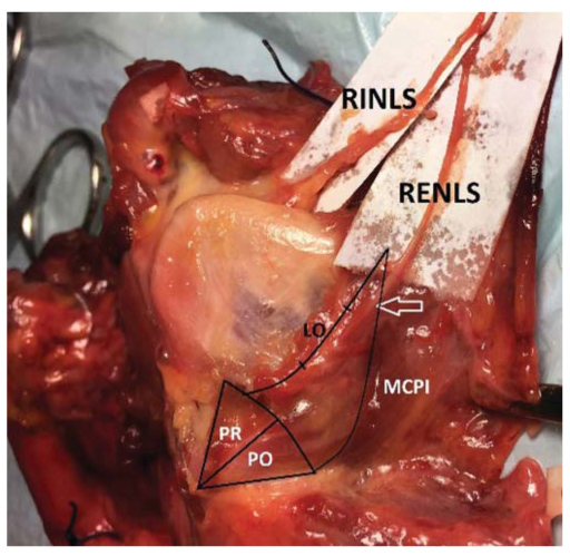 4. Fig. 4. Type III RENLS. Left view. PR - pars recta MCT, PO - pars obliqua MCT. MST, MTH cut off. Marked area of attachment of these muscles - LO. The arrow indicates the “entry point” of the nerve in the MCPI. | |