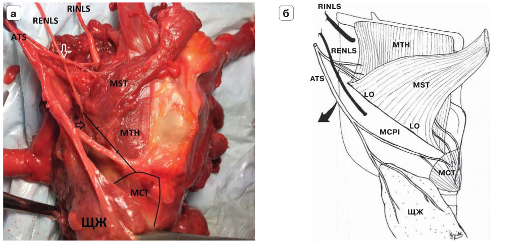 5. Fig. 5. Syntopy RENLS with the superior thyroid artery. a - right side view, type III (the “arrow” point of the nerve is indicated by a black arrow). The superior thyroid artery is laterally retracted. The white arrow indicates the location of the intersection of the nerve with the branches of the superior thyroid artery. ATS - arteria thyroidea superior, superior thyroid artery (PNA). b - drawing scheme. | |
