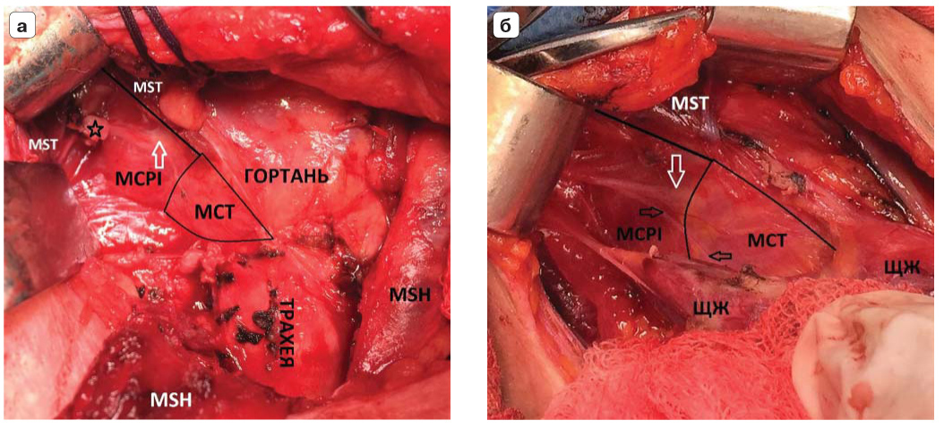 7. Fig. 7. Intraoperative picture of the location of RENLS and major anatomical landmarks. and - a bed of the right share (the thyroidectomy is executed). I type RENLS. MSH is crossed on the right. An asterisk denotes a ligated sprig of the superior thyroid artery. b - right side view. I type RENLS. The black arrow marks an additional branch of the nerve heading towards the cricoid joint. The white arrows mark the entry points of the RENLS. Arcus tendineus looks like a whitish arcuate retraction zone between MCPI and MCT. | |