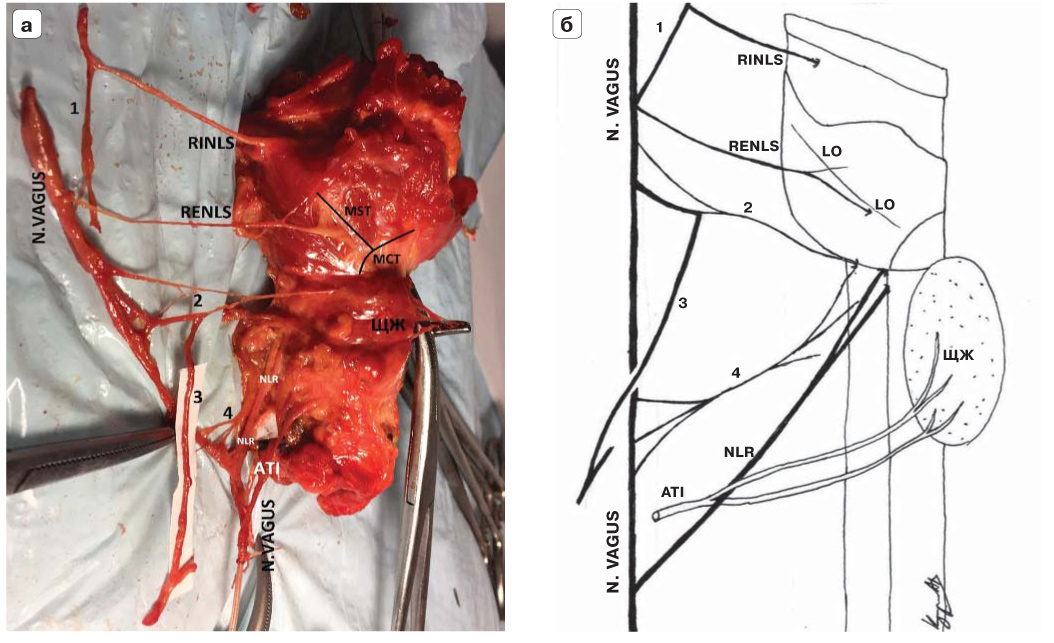 6. Fig. 6. Additional branches RENLS. Left view. a - the allocated RENLS has two branches: 1 - the main trunk with the “entry point” in the projection of the middle third of LO (type II); 2 - the lower branch, going to the rear surface of the upper pole of the thyroid. b - the thyroid gland share is mobilized, set aside forward and medially. The main trunk RENLS cut off. The lower branch of the nerve is directed to the crico-thyroid connection. NLR is also taken on a ligature holder, retracted anteriorly and medially. Selected lower thyroid artery, forming two branches. The black arrow indicates the location of the “entrance” of the lower RENLS branch in the area of the cricoid-like connection. The white arrows are the “entrance” to the larynx of the two branches of the NLR. ATI - arteria thyroidea inferior, inferior thyroid artery (PNA). | |