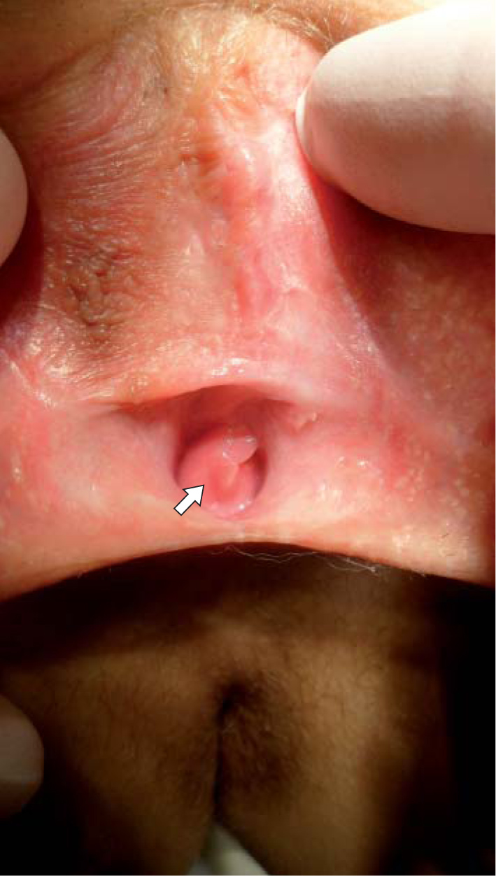5. Fig. 2. A typical appearance of the external genitalia after the first stage of feminizing plastic surgery. Artificially created labia minora (black arrows) and the clitoris head (white arrow) are determined. | |