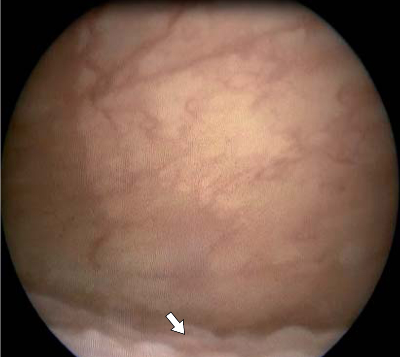 6. Fig. 3. An endoscopic picture of granular cystitis in a patient with impaired sex formation and hypospadias (the arrow indicates the granular element of inflammation). | |