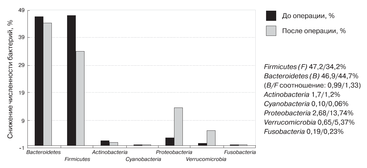 J. Graessler и соавт. анализировали состав МК до и через 3 мес после проведения ГШ [30]. В исследование были включены 6 пациентов с ожирением и СД2 в возрасте 38–53 лет, с индексом массы тела (ИМТ) 40,9–52,1 кг/м2. Через 3 мес после хирургического вмешательства у всех пациентов обнаружено снижение ИМТ на 15–32% от исходного показателя. Также выявлено снижение систолического (у 5/6), диастолического артериального давления (у всех), уровня триглицеридов (у 5/6), общего холестерина и холестерина липопротеинов низкой плотности (у всех). Дооперационный анализ таксономического состава выявил высокий индекс альфа-разнообразия (показатель, определяющий многообразие флоры), что характеризует микробиоту этих пациентов как потенциально более устойчивуюк внешнему воздействию. Наиболее распространенными были бактерии, принадлежащие к Firmicutes, Bacteroidetes, Actinobacteria, Proteobacteria и Verrucomicrobia. После проведения ГШ выявлено снижение численности Firmicutes (с 47,2 до 34,2%), Bacteroidetes (с 46,9 до 44,7%), Actinobacteria (с 1,7 до 1,2%) и Cyanobacteria (с 0,1 до 0,06%) и увеличение Proteobacteria (с 2,68 до 13,74%), Verrucomicrobia (с 0,65 до 5,37%) и Fusobacteria (с 0,19 до 0,23%) (рис. 1).