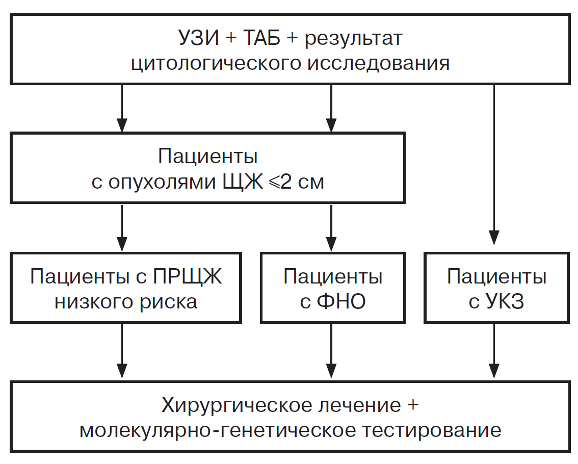 Обоснование. При дооперационной диагностике новообразований щитовидной железы (ЩЖ) цитологическое исследование материала тонкоигольной аспирационной биопсии (ТАБ) является золотым стандартом и служит основанием для планирования лечебной стратегии. Однако в 10–30% случаев доброкачественный или злокачественный характер новообразования ЩЖ не может быть однозначно установлен по цитологии, что приводит к невозможности заранее выбрать оптимальную стратегию лечения. Для таких случаев крайне актуален поиск методов уточняющей дифференциальной диагностики, среди которых наиболее перспективным в настоящее время считается мутационное тестирование.