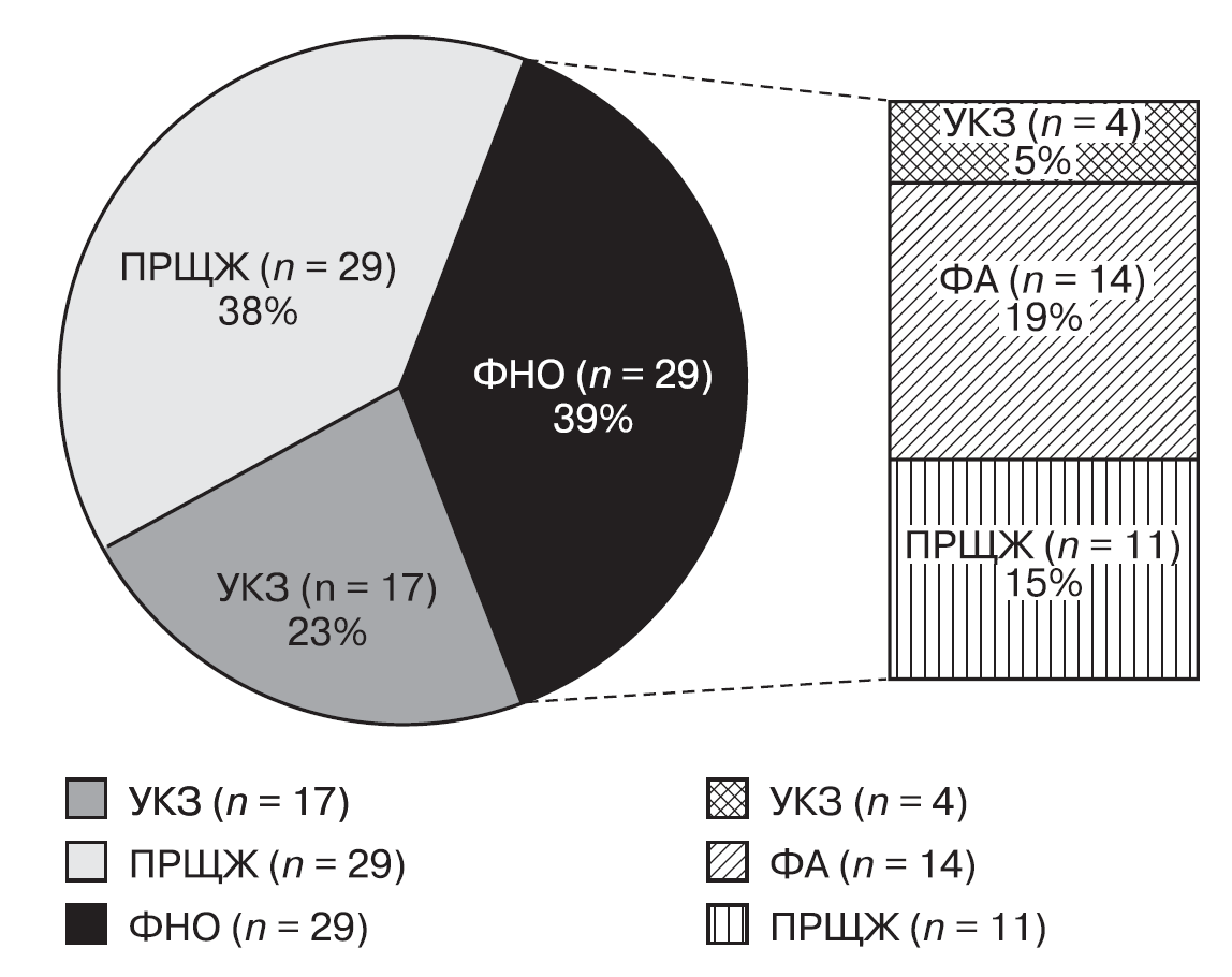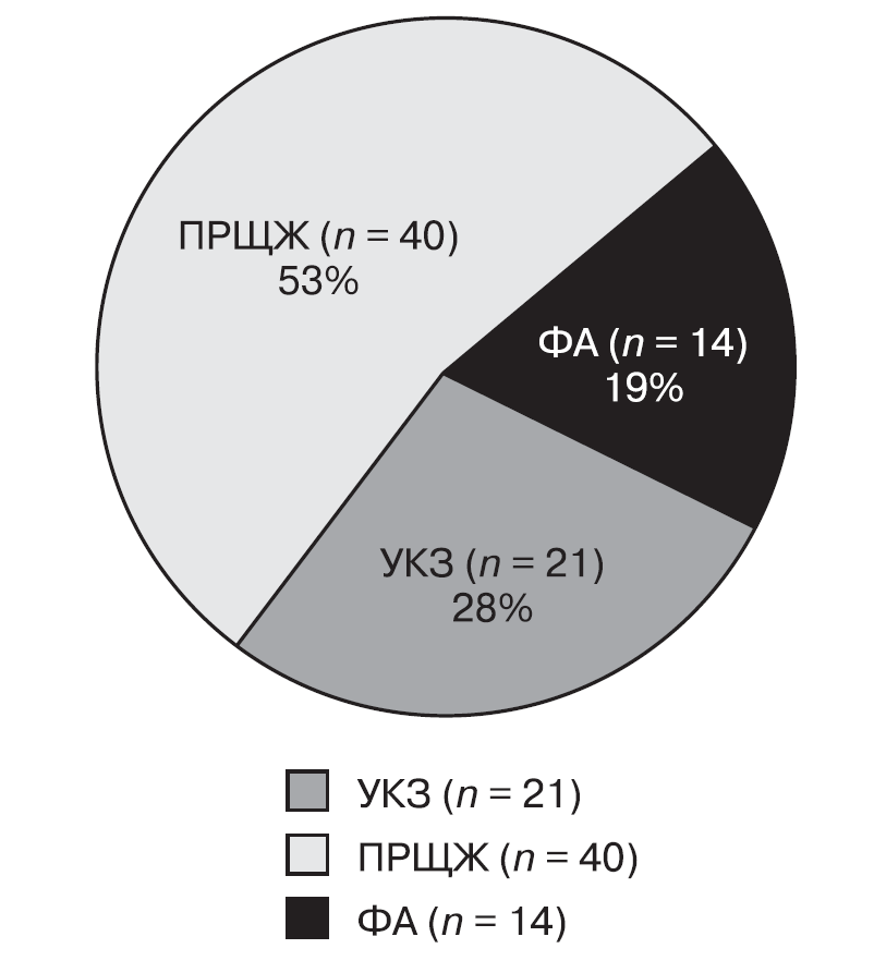3. Риc. 3. Распределение пациентов по группам на основании гистологического заключения (n = 75, %): УКЗ – узловой коллоидный зоб, ПРЩЖ – папиллярный рак щитовидной железы, ФА – фолликулярная аденома.