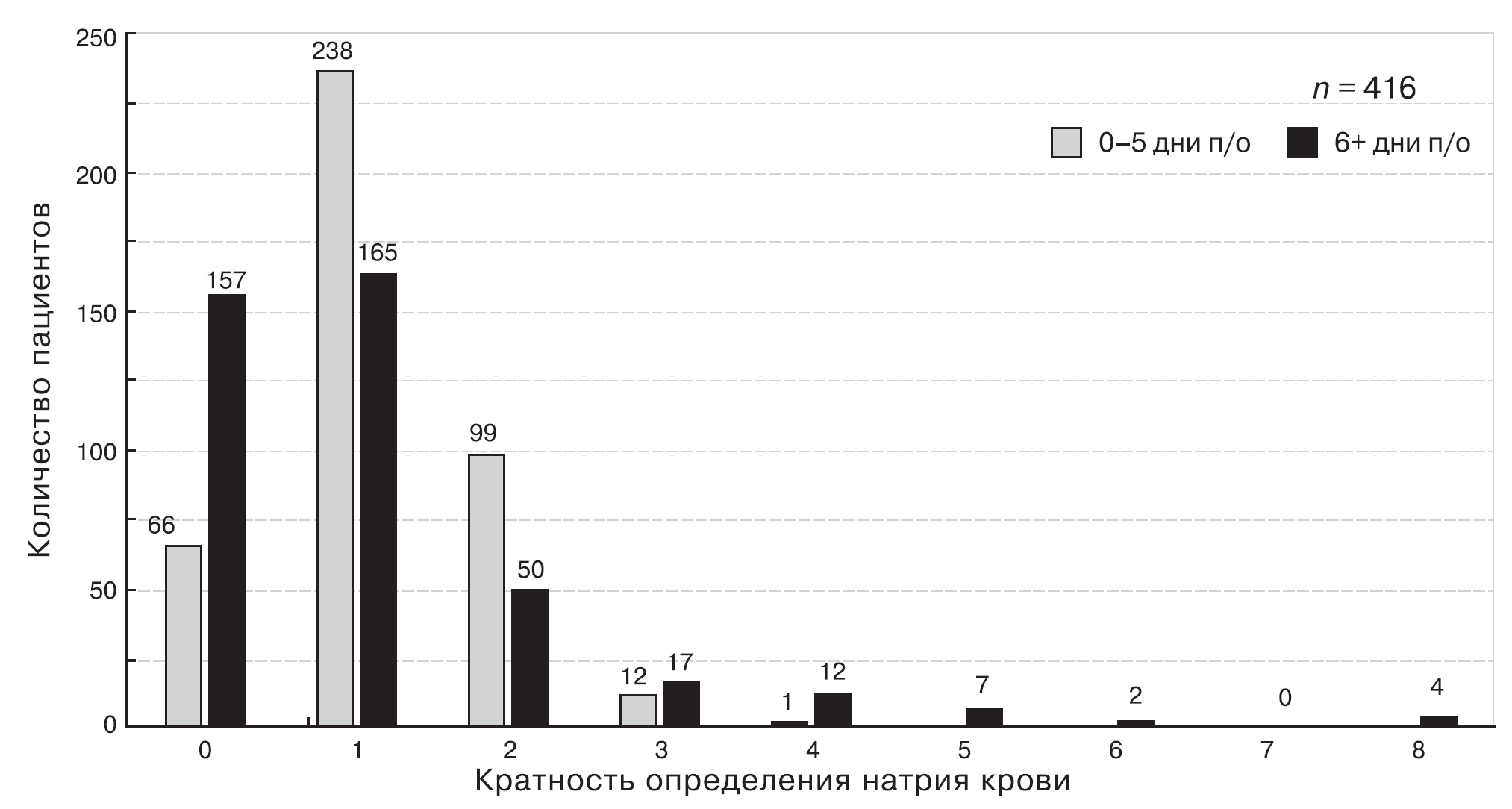 2. Рис. 2. Кратность определения натрия крови в послеоперационном периоде отдельно на 0–5-й и 6+ дни после перенесенной трансназальной аденомэктомии. | |