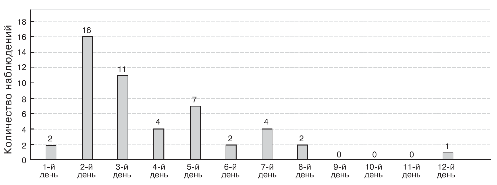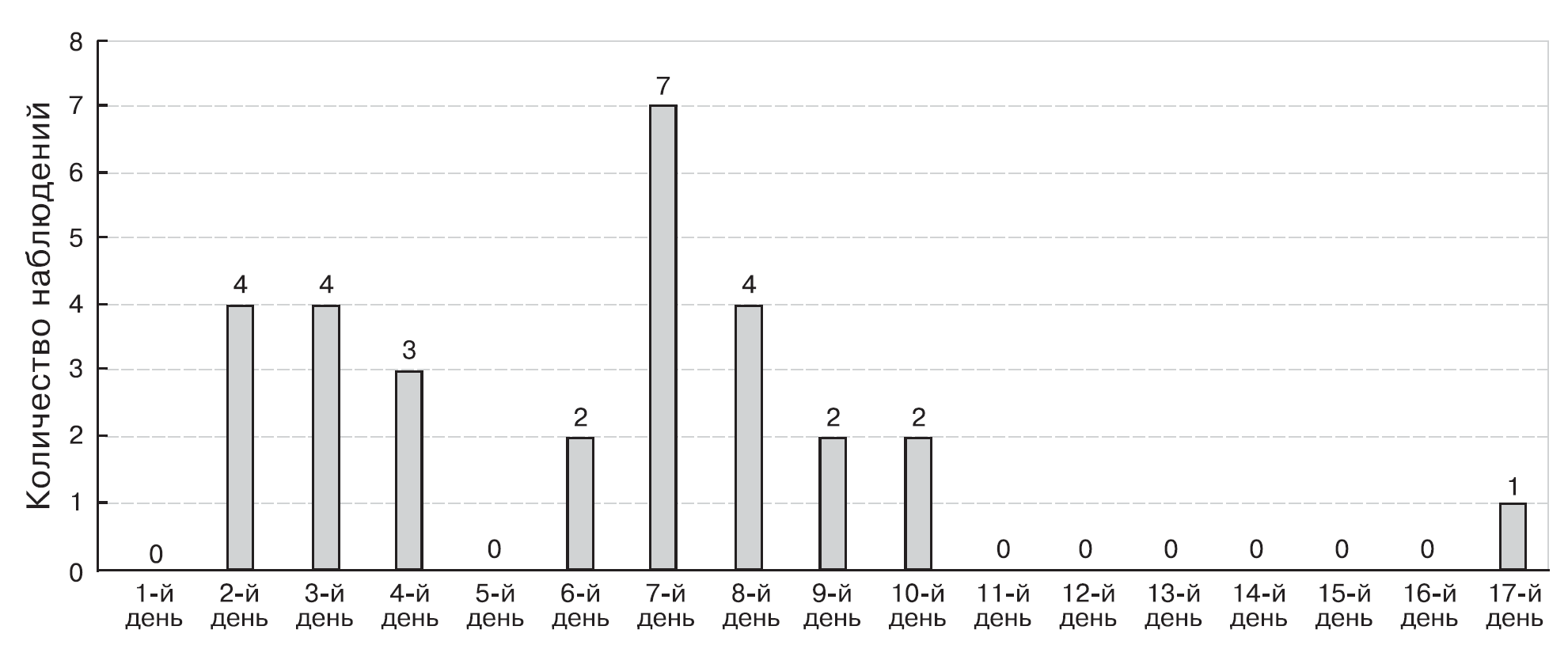 3. Рис. 3. Дни дебюта гипонатриемии после нейрохирургических оперативных вмешательств (n = 29). | |