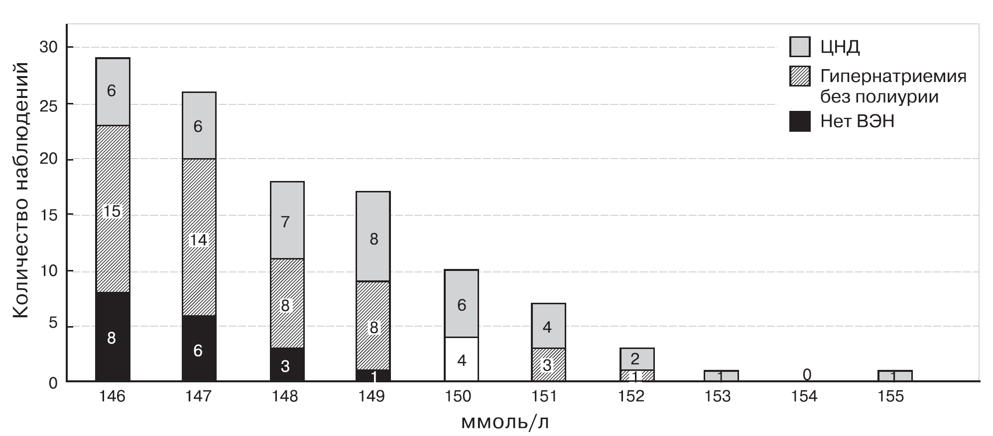4. Рис. 4. Частота различных клинико-этиологических нозологий водно-электролитных нарушений (ВЭН) у пациентов с гипернатриемией после нейрохирургических оперативных вмешательств (n = 112). | |