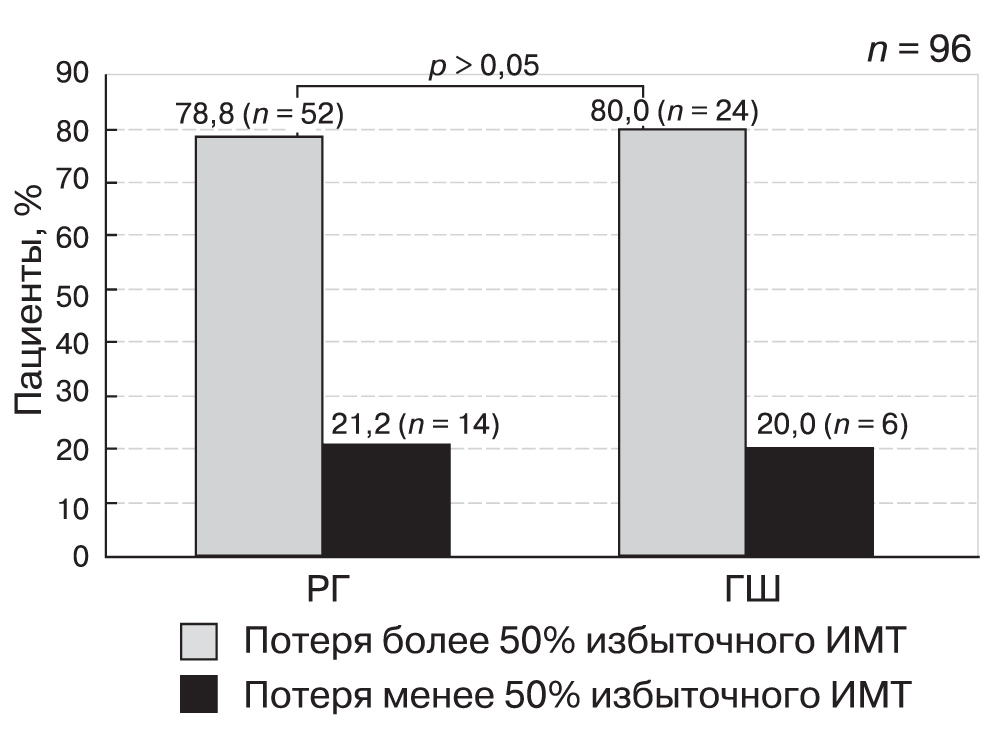 В точке надир была выявлена сопоставимая эффективность РГ и ГШ в отношении снижения массы тела. Так, в группе РГ потери избыточного ИМТ (%EBMIL) более 50% достигли 52 (78,8%) пациента из 66, в группе ГШ – 24 (80,0%) пациента из 30 (рис. 1). Значимой разницы по количеству пациентов, достигших 50% EBMIL, между РГ и ГШ выявлено не было (р > 0,05).