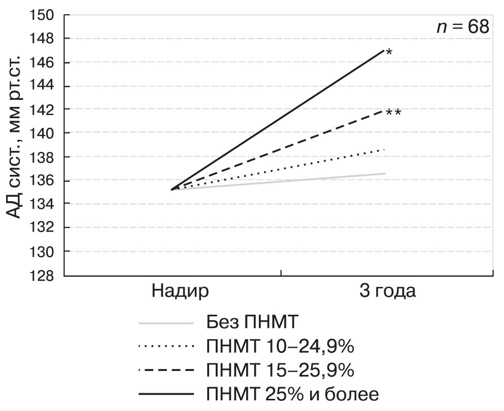 В приведенном исследовании получены данные о сопоставимой эффективности РГ и ГШ в снижении массы тела в точке надир. За 36 мес наблюдения ПНМТ более 15% был выявлен у 32,5% пациентов после РГ и 17,2% пациентов после ГШ (p > 0,05). В работе показано, что ПНМТ становится клинически значимым (выявляется значимое повышение систолического АД) при достижении 15% от потерянной массы тела в точке надир.