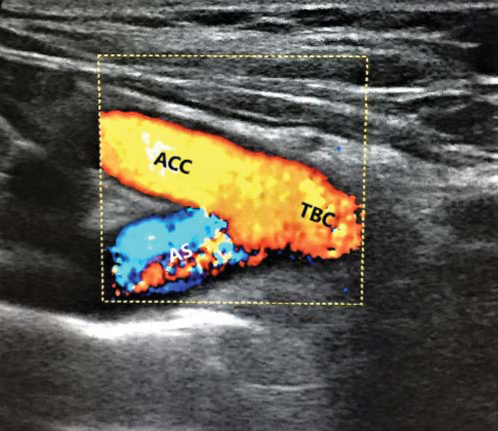 1. Fig. 1. Ultrasound of the vessels of the neck (color duplex scanning). Identification of the Y-sign. ACC - arteria carotis communis dexter, AS - arteria subclavia dexter, TBC - truncus brachiocephalicus. | |