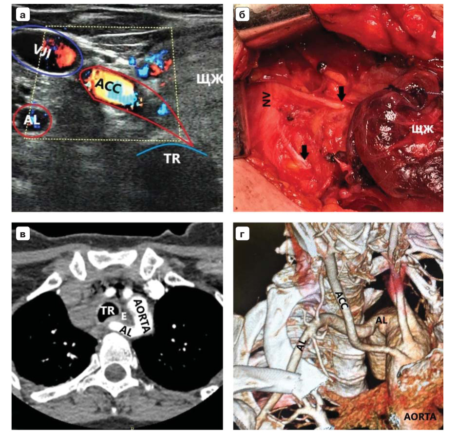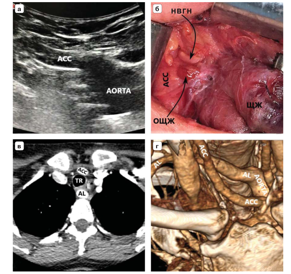 2. Fig. 2. The patient is 32 years old, body mass index (BMI) - 18.5. a - ultrasound of the vessels of the upper mediastinum with a convex sensor in B-mode (color duplex scanning is less informative due to a lot of interference from the aortic arch). The right common carotid artery was traced to the aortic arch (BCC was not detected). b - intraoperative picture. Type IIA NVGN (according to Avisse – Toniato) has a horizontal course. c - axial CT scan with angiography of the vessels of the aortic arch. AL is located behind the trachea and esophagus. d - computer three-dimensional reconstruction demonstrates AL syntopia with a common carotid artery. AL is the last, fourth branch of the aortic arch. ACC - arteria carotis communis dexter, TR - trachea, E - esophagus. | |