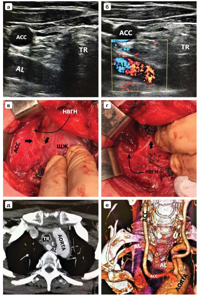 5. Рисунок 2. Пациентка 32 лет, индекс массы тела (ИМТ) – 18.5. Г – Компьютерная трехмерная реконструкция показывает синтопию AL с общей сонной артерией. AL является последней четвертой ветвью дуги аорты. ACC – arteria carotis communis dexter, TR – trachea, E – esophagus. | |