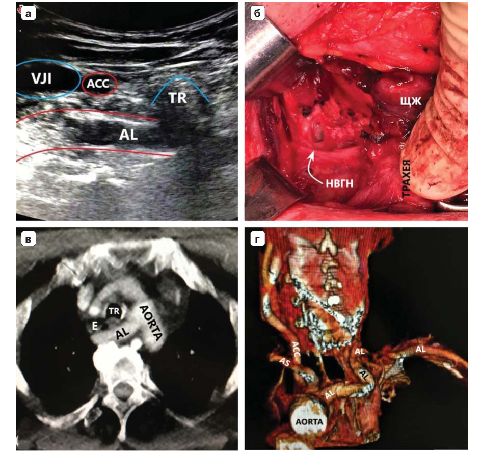 16. Fig. 5. The patient is 62 years old, BMI is 51.4. a - ultrasound of the vascular bundle of the right half of the neck with a convex sensor. AL “leaves” due to the trachea and is located almost horizontally, high on the border of the neck and upper mediastinum. b - intraoperative picture. Type IIA NVGN (according to Avisse – Toniato) has a horizontal course. c - axial CT scan with angiography of the vessels of the aortic arch. AL is located behind the trachea and esophagus. g - computer three-dimensional reconstruction (rear view). AL is the last, fourth branch of the aortic arch. ACC - arteria carotis communis (A - dexter, D - sinister), TR - trachea, E - esophagus. VJI - vena jugularis interna dexter, AS - arteria subclavia sinister. | |