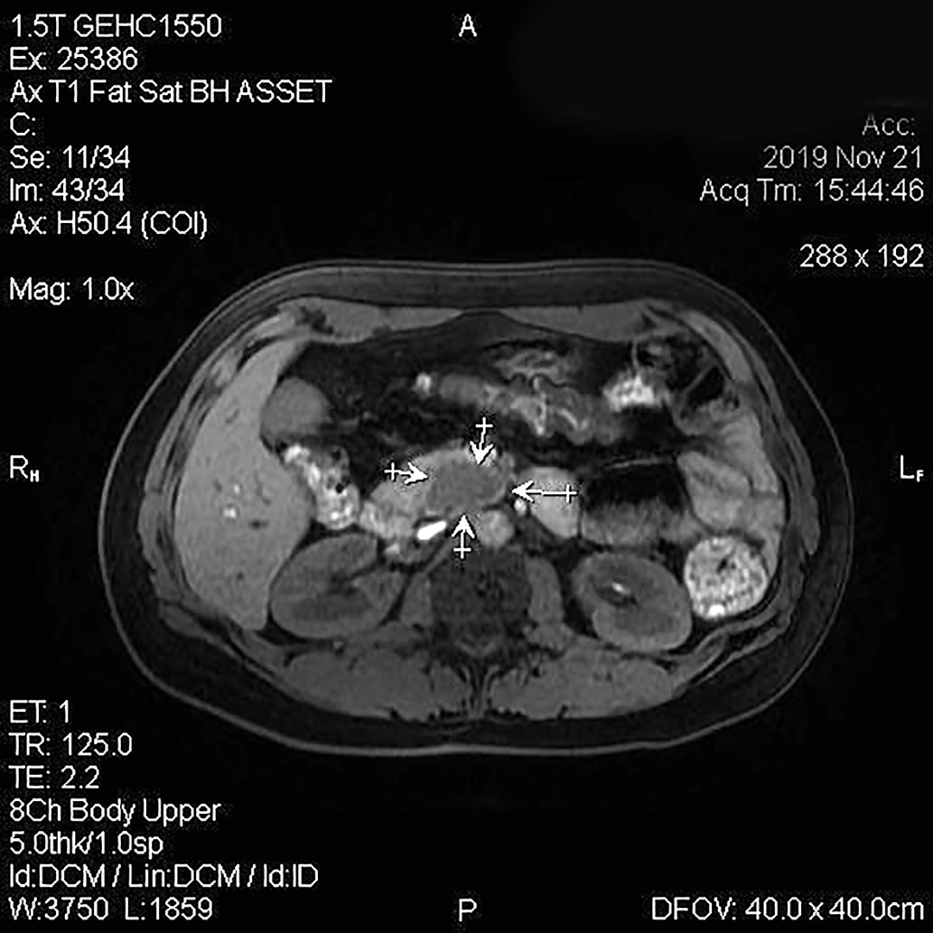 2. Рисунок 2. Магнитно-резонансная томография органов брюшной полости с контрастным усилением. Стрелками показано образование в поджелудочной железе. | |