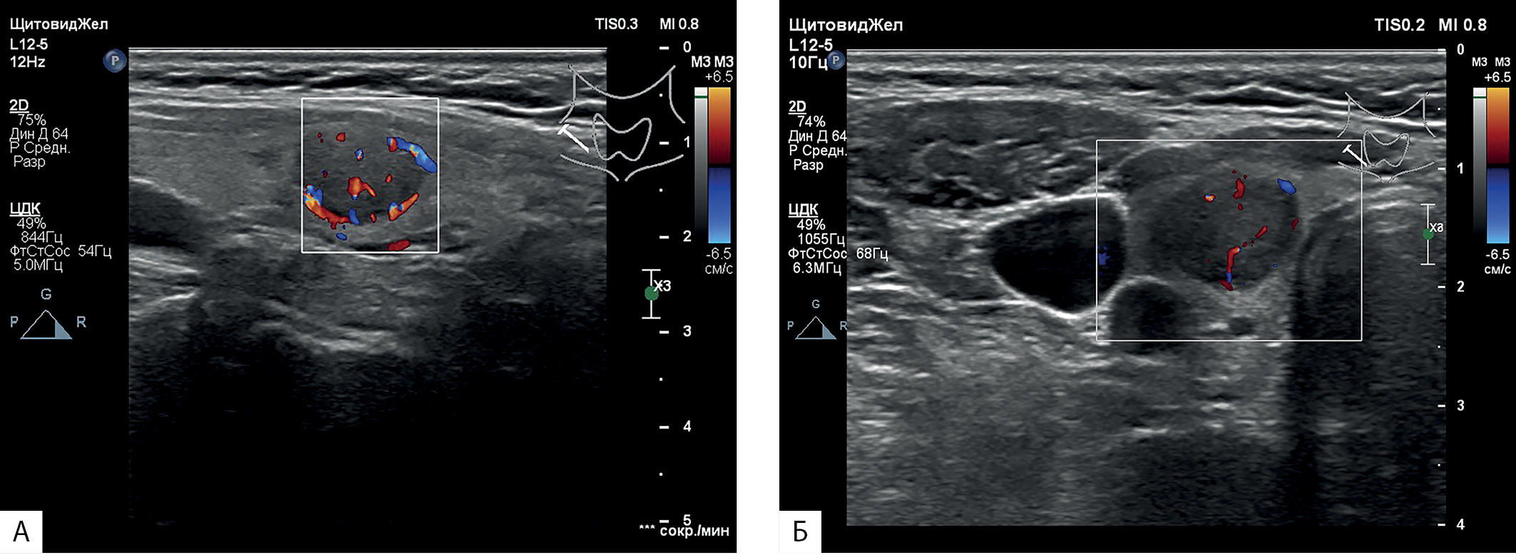 1. Рисунок 1. Ультразвуковое изображение правой доли щитовидной железы в В-режиме с использованием цветного допплеровского картирования: А — продольное сканирование; Б — поперечное сканирование. | |