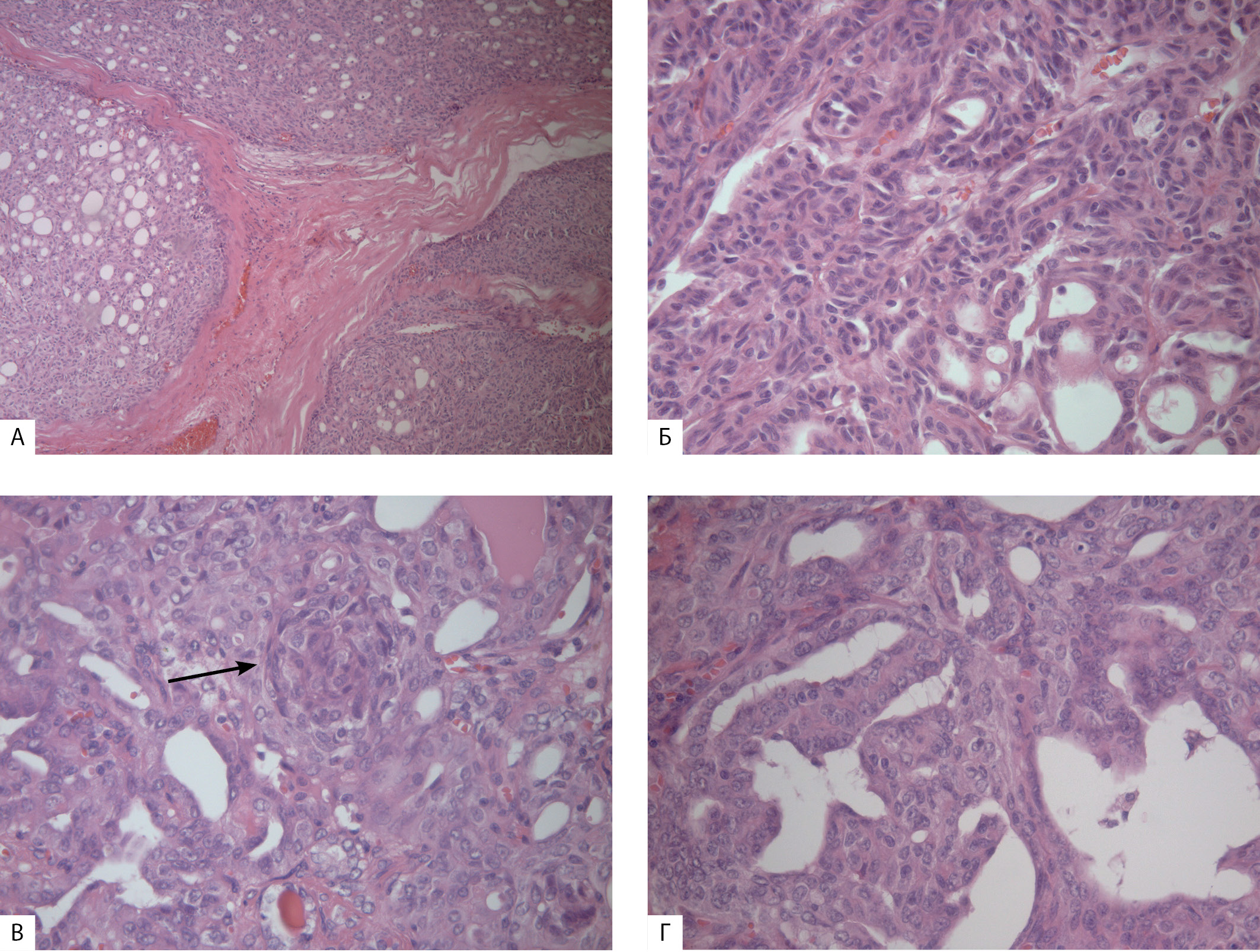 2. Рисунок 2. Крибриформно-морулярный вариант папиллярного рака щитовидной железы, окраска гематоксилином и эозином: А — множественные узлы (ув. х40); Б — криброзные (дырчатые), трабекулярные, солидные, микрофолликулярные структуры опухоли (ув. х125); В — морула (указана стрелкой), окруженная криброзными и солидными структурами опухоли (ув. х250); Г — участки папиллярного строения в опухолевом узле (ув. х250). Микрофото из личного архива Казанцевой И.А. и Бондаренко Е.В. | |