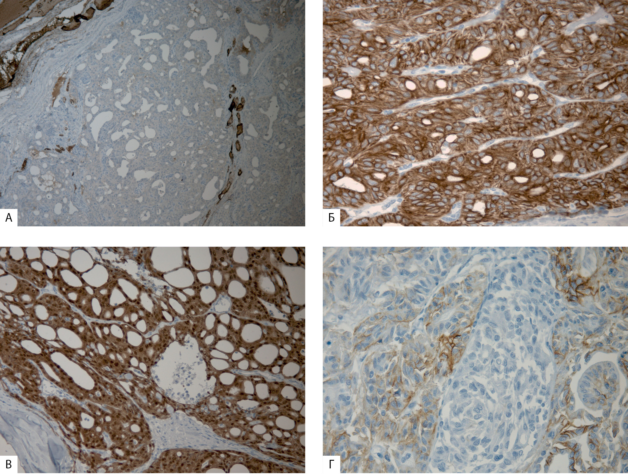3. Рисунок 3. Иммунофенотип крибриформно-морулярного варианта папиллярного рака щитовидной железы: А — отсутствие экспрессии тиреоглобулина в клетках опухоли и наличие экспрессии в ткани неизмененной щитовидной железы, окружающей опухолевые структуры (ув. x125); Б — интенсивная цитоплазматическая экспрессия цитокератина-19 (ув. x250); В — ядерно-цитоплазматическая экспрессия β-катенина в клетках опухоли (ув. x250); Г — неравномерная, очаговая мембранно-цитоплазматическая экспрессия CD56 в папиллярных структурах опухоли (ув. х250). Микрофото из личного архива Казанцевой И.А. и Бондаренко Е.В. | |
