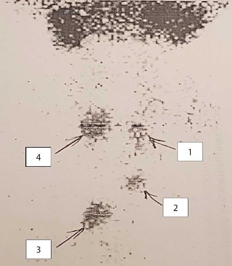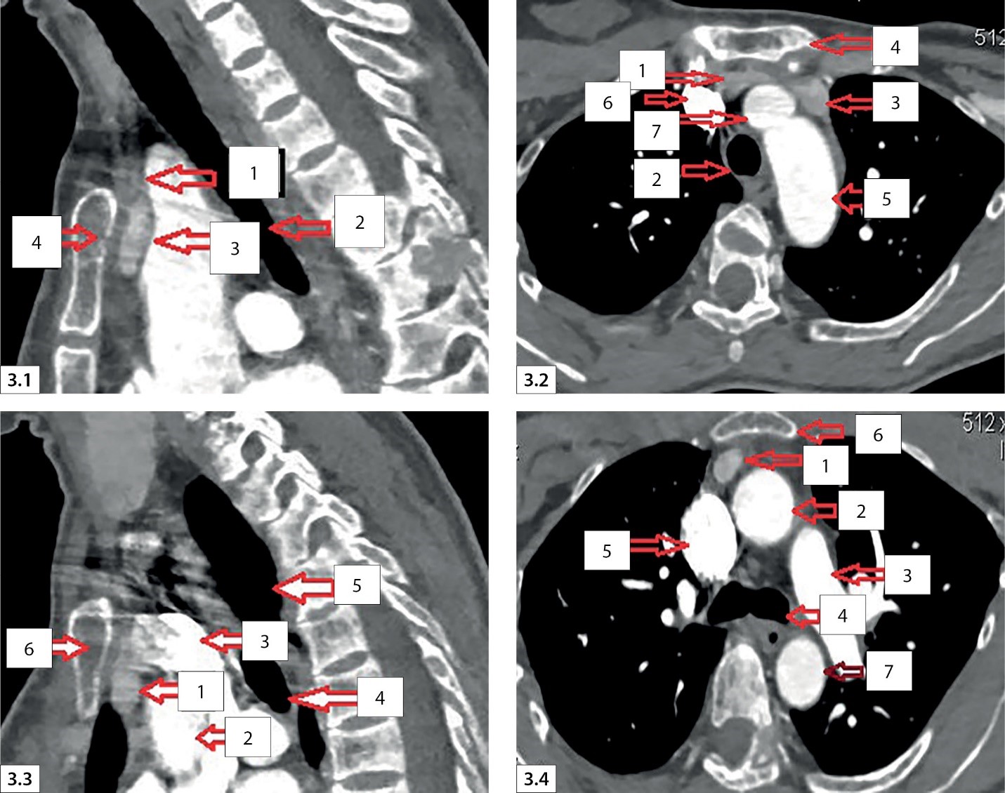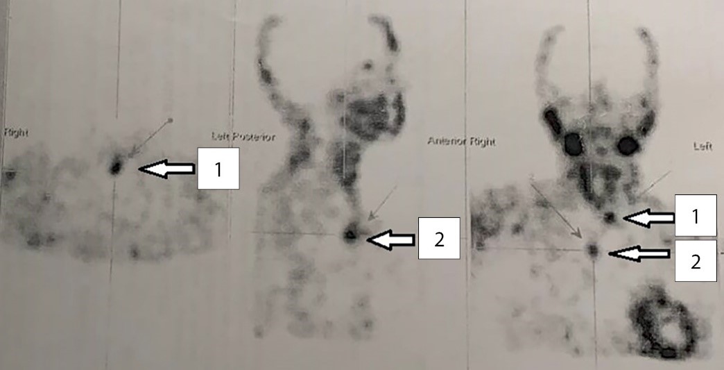 2. Рисунок 1. Сцинтиграфия околощитовидных желез. Стрелками указаны анатомические структуры: 1 — левая верхняя ОЩЖ; 2 — левая нижняя ОЩЖ; 3 — правая нижняя ОЩЖ; 4 — правая верхняя ОЩЖ.