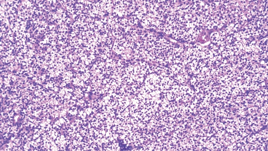 7. Рисунок 5. Микрофотография операционного материала. Окраска гематоксилином-эозином. Увеличение 10×0,25. Ткань нижней правой ОЩЖ. Все пространство препарата представлено картиной диффузной гиперплазии из главных темных клеток, без собственной капсулы и ободка неизмененной ткани. Аналогичной картиной представлен микропрепарат нижней левой ОЩЖ.