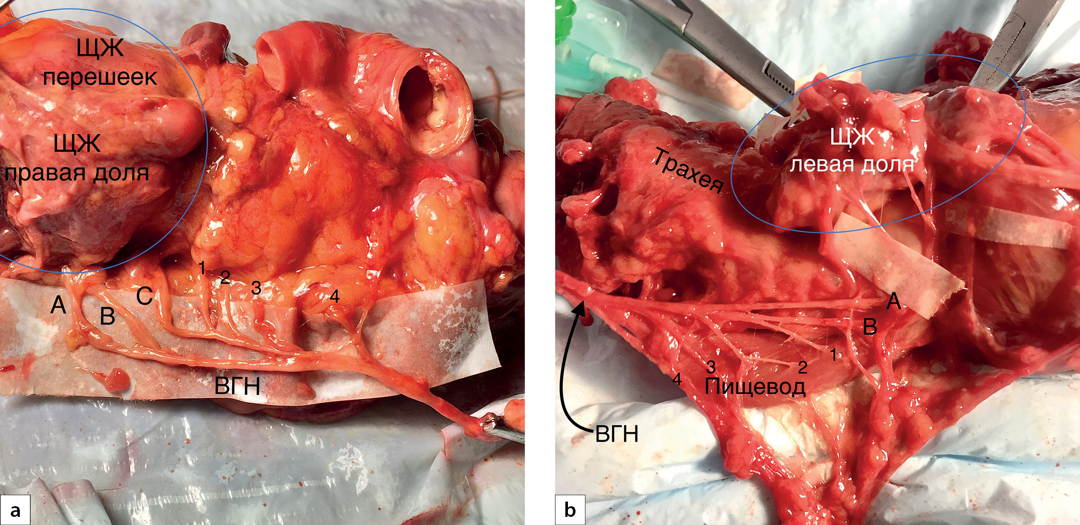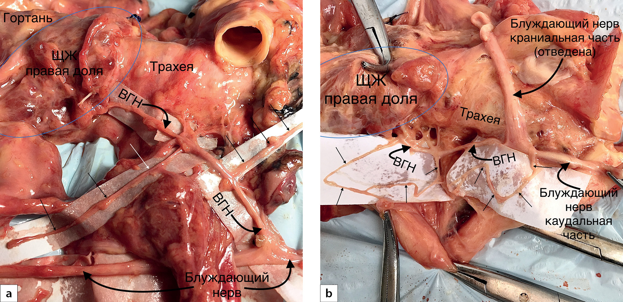 6. Рис. 6. Нервно-артериальный перекрест на уровне основного ствола нижней щитовидной артерии (НЩА) в сагиттальной проекции. a — схематичный рисунок (сагиттальная проекция). Возвратный гортанный нерв (ВГН) образует один перекрест с основным стволом НЩА; b — макропрепарат. ВГН образует один перекрест с основным стволом НЩА.