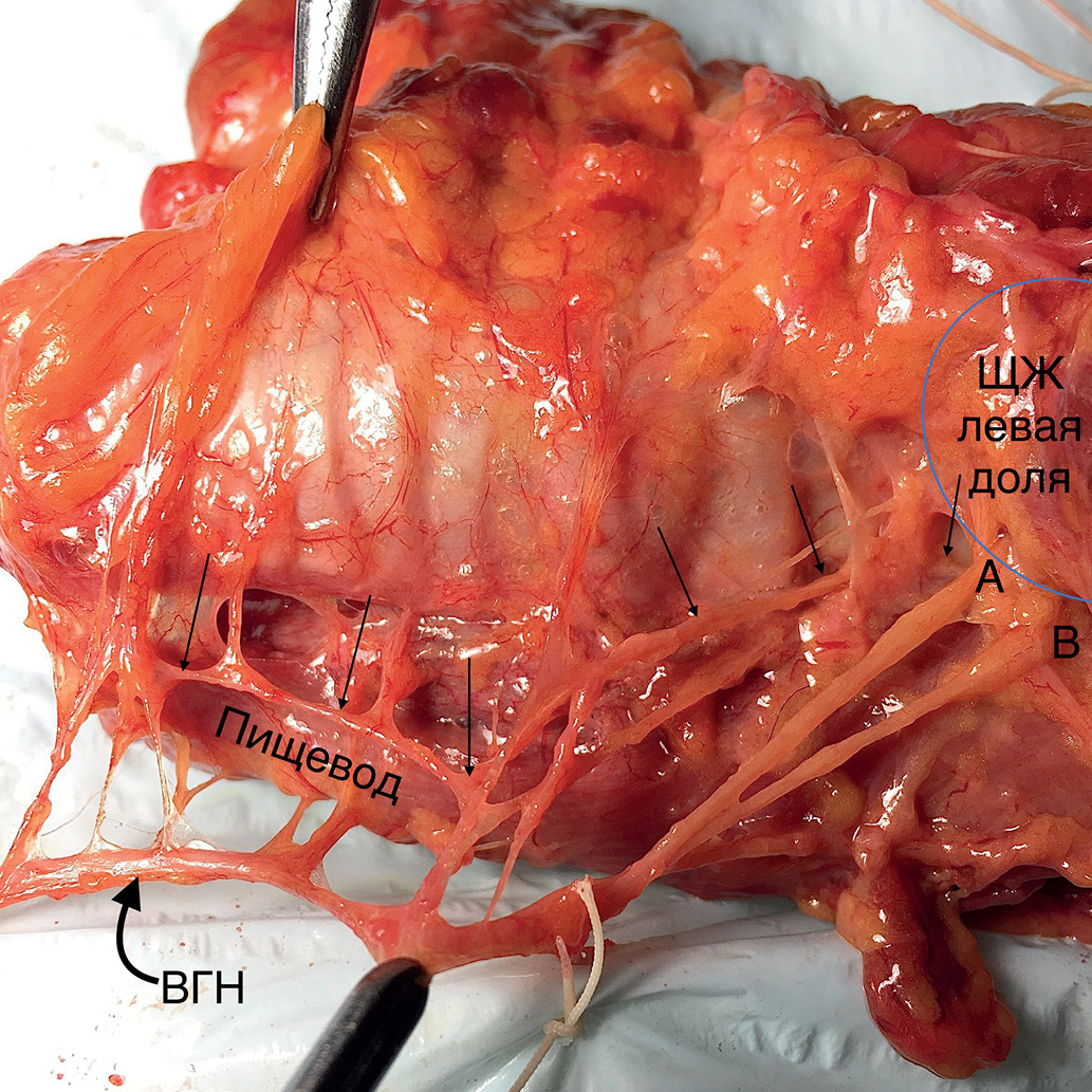 2. Рис. 2. Длинные трахеопищеводные ветви возвратного гортанного нерва (отмечены тонкими прямыми стрелками). А, В — гортанные ветви.