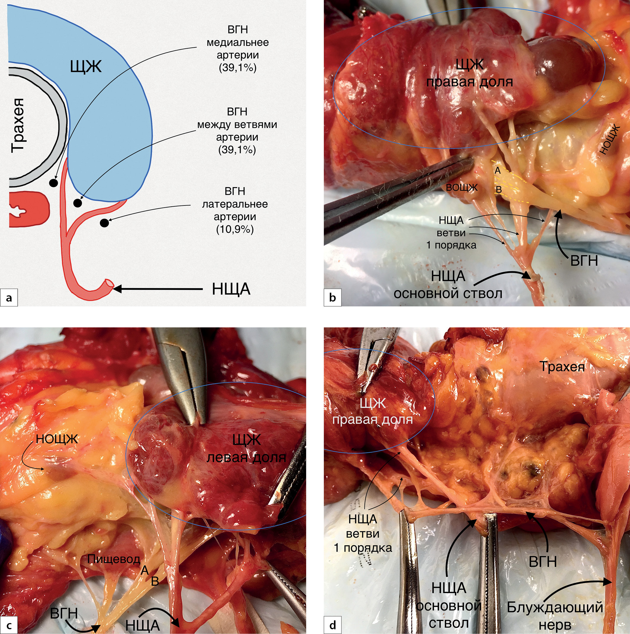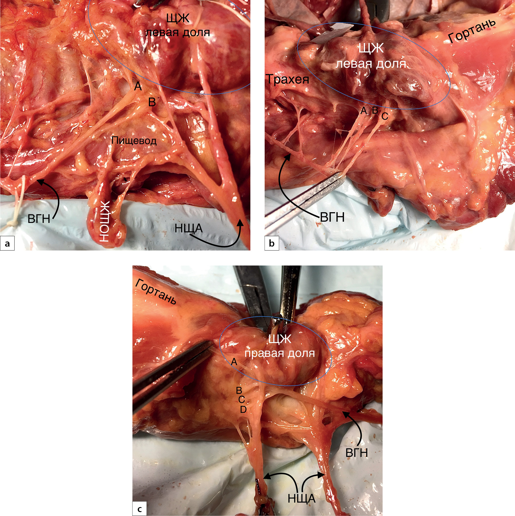 a — две гортанных ветви; b — три гортанных ветви; c — четыре гортанных ветви. А, B, C, D — гортанные ветви. НОЩЖ — нижняя околощитовидная железа.