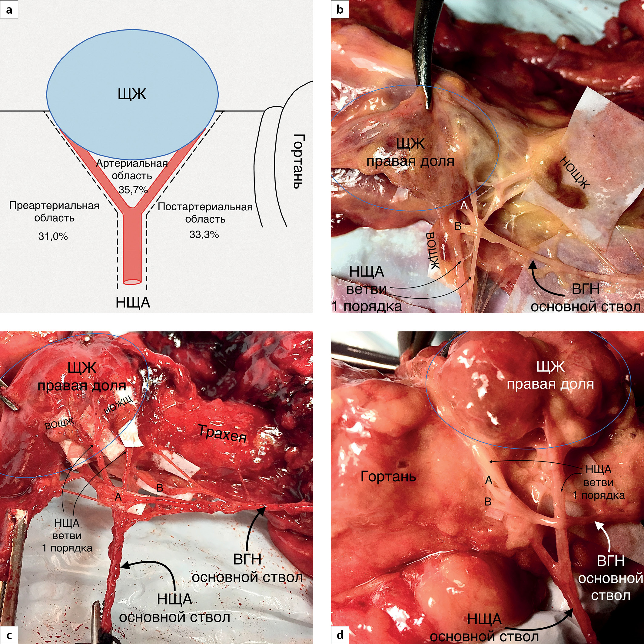 9. Рис. 9. Локализация точек бифуркации нерва. a — схематичный рисунок деления хода возвратного гортанного нерва (ВГН) на зоны относительно нижней щитовидной артерии (НЩА) со статистическими данными (сагиттальная проекция); b — макропрепарат. Деление ВГН на гортанные ветви в артериальной области; c — макропрепарат. Деление ВГН на гортанные ветви в преартериальной области; d — макропрепарат. Деление ВГН на гортанные ветви в постартериальной области. А, В — гортанные ветви ВГН; ВОЩЖ — верхняя околощитовидная железа; НОЩЖ — нижняя околощитовидная железа.