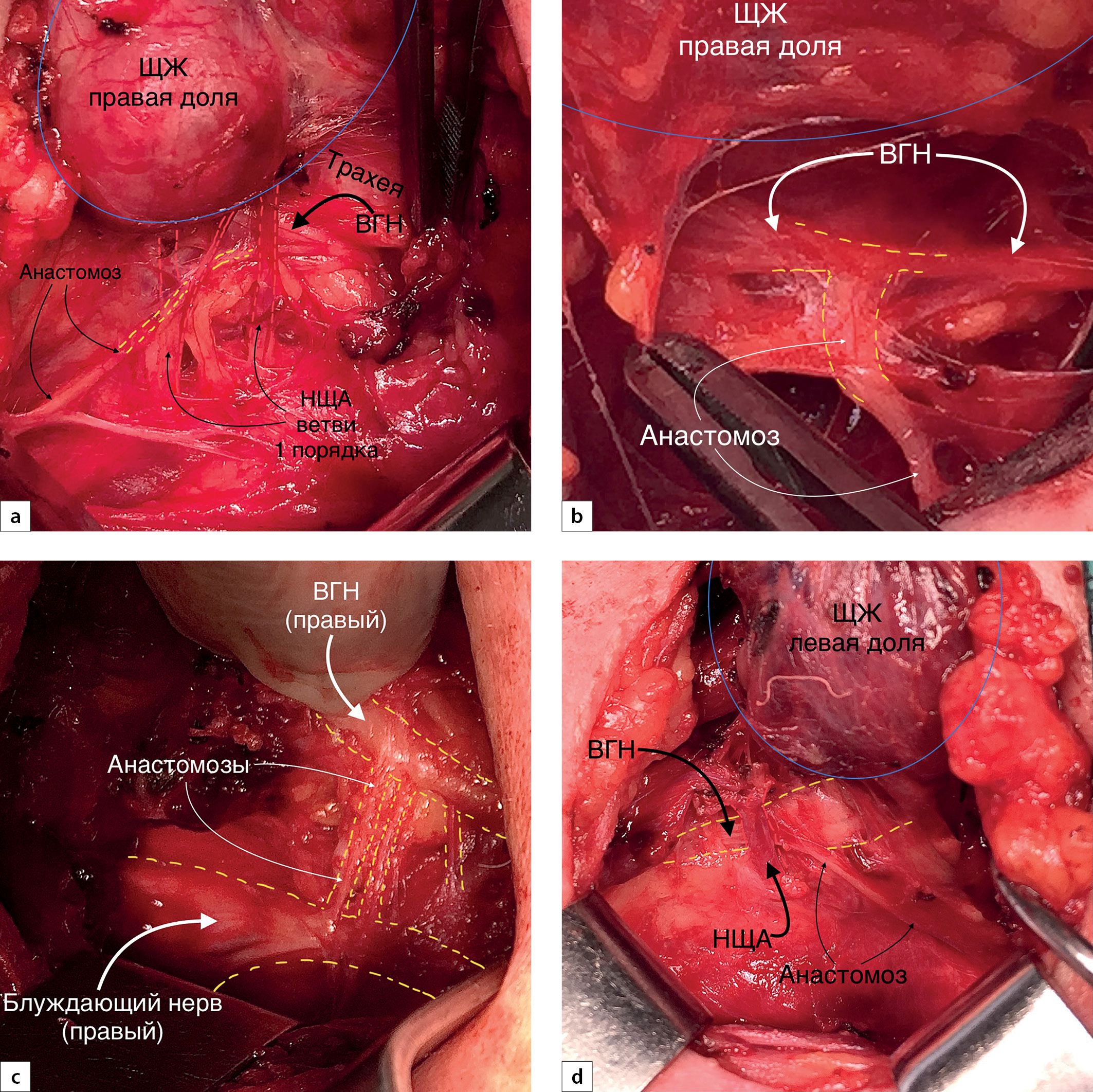 По мнению ряда авторов, основной причиной послеоперационных парезов гортани, несмотря на постоянную интраоперационную визуализацию и применение нейромониторинга, является непростая, а порой даже индивидуальная топография ВГН. Исследователи определили следующие «сложные точки» в анатомии нерва: 1) частое образование экстраларингеальных ветвей; 2) синтопическое расположение ВГН и нижней щитовидной артерии (НЩА) (описано до 28 вариантов нервно-артериальных перекрестов); 3) аномалии нерва (невозвратный гортанный нерв) [19][20]. Этим авторы обосновывают необходимость в ходе оперативного вмешательства идентифицировать не только основной ствол ВГН, но и отдельные его экстраларингеальные ветви [12][21][22].