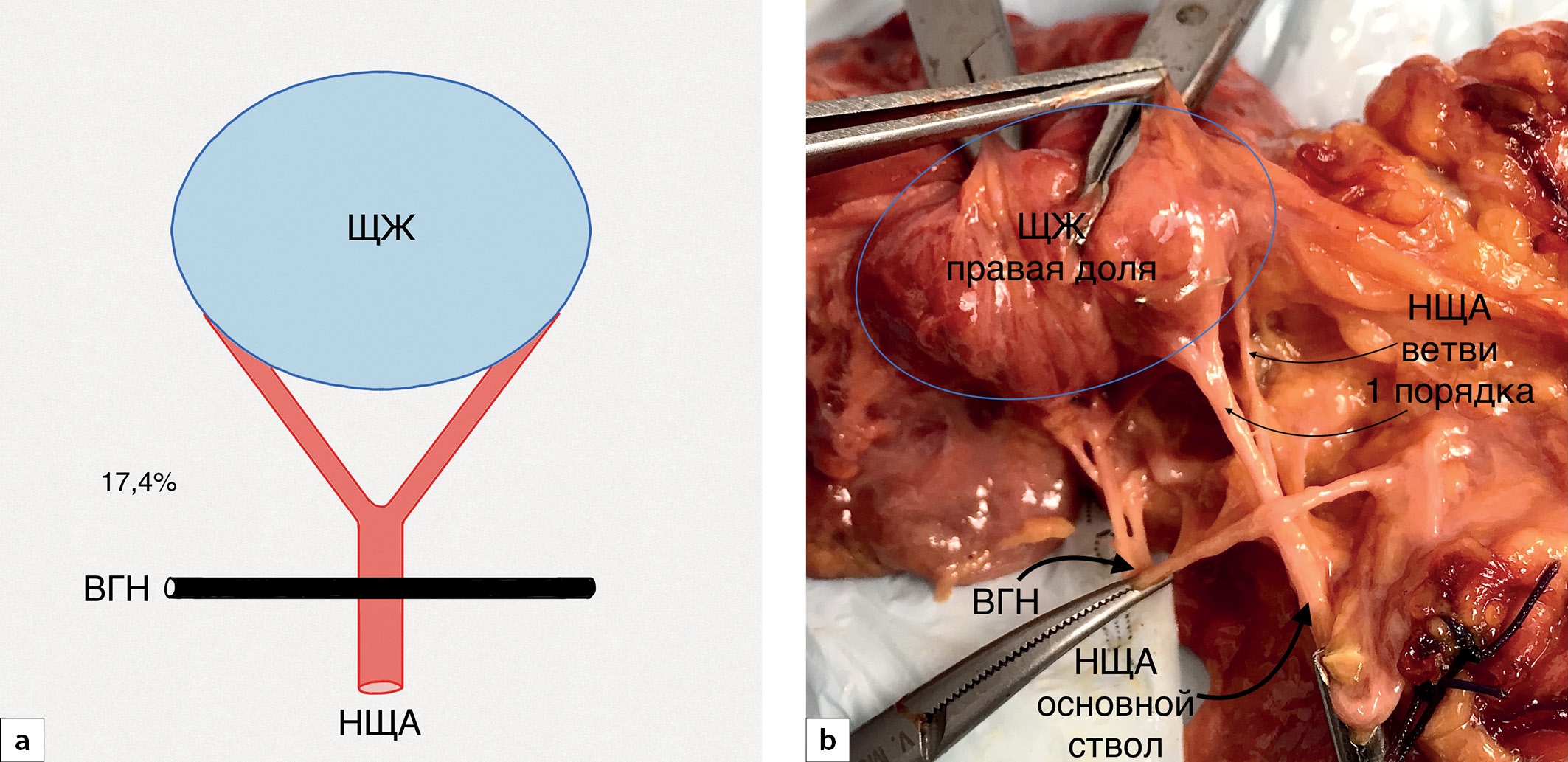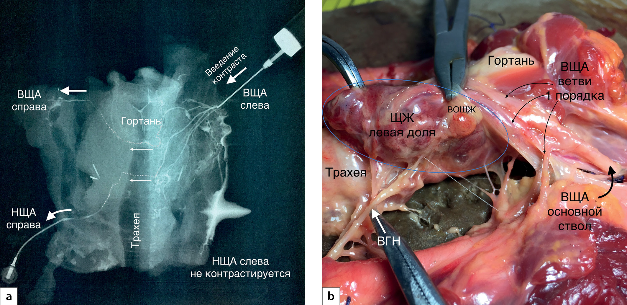 6. Рис. 6. Нервно-артериальный перекрест на уровне основного ствола нижней щитовидной артерии (НЩА) в сагиттальной проекции. a — схематичный рисунок (сагиттальная проекция). Возвратный гортанный нерв (ВГН) образует один перекрест с основным стволом НЩА; b — макропрепарат. ВГН образует один перекрест с основным стволом НЩА.