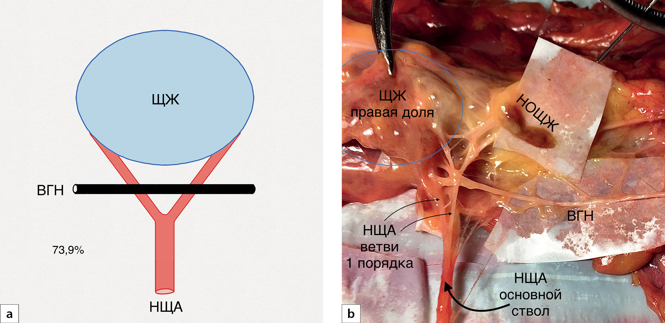 5. Рис. 5. Нервно-артериальный перекрест на уровне ветвей нижней щитовидной артерии (НЩА) в сагиттальной проекции. a — схематичный рисунок (сагиттальная проекция). Возвратный гортанный нерв (ВГН) образует два перекреста с ветвями первого порядка НЩА; b — макропрепарат. ВГН образует два перекреста с ветвями первого порядка. НОЩЖ — нижняя околощитовидная железа.