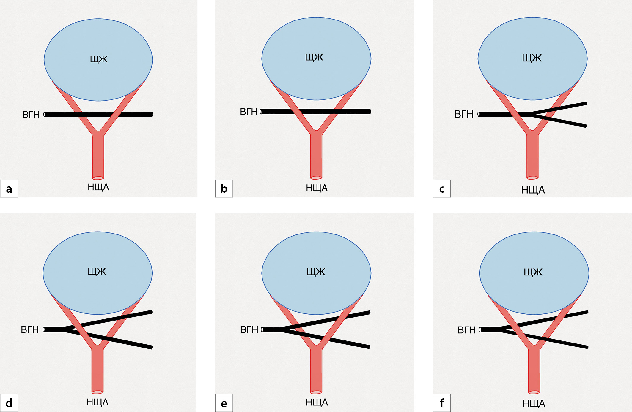8. Рис. 8. Варианты расположения возвратного гортанного нерва между ветвями нижней щитовидной артерии. a, b, c, d, e, f — схематичные рисунки (сагиттальная проекция).