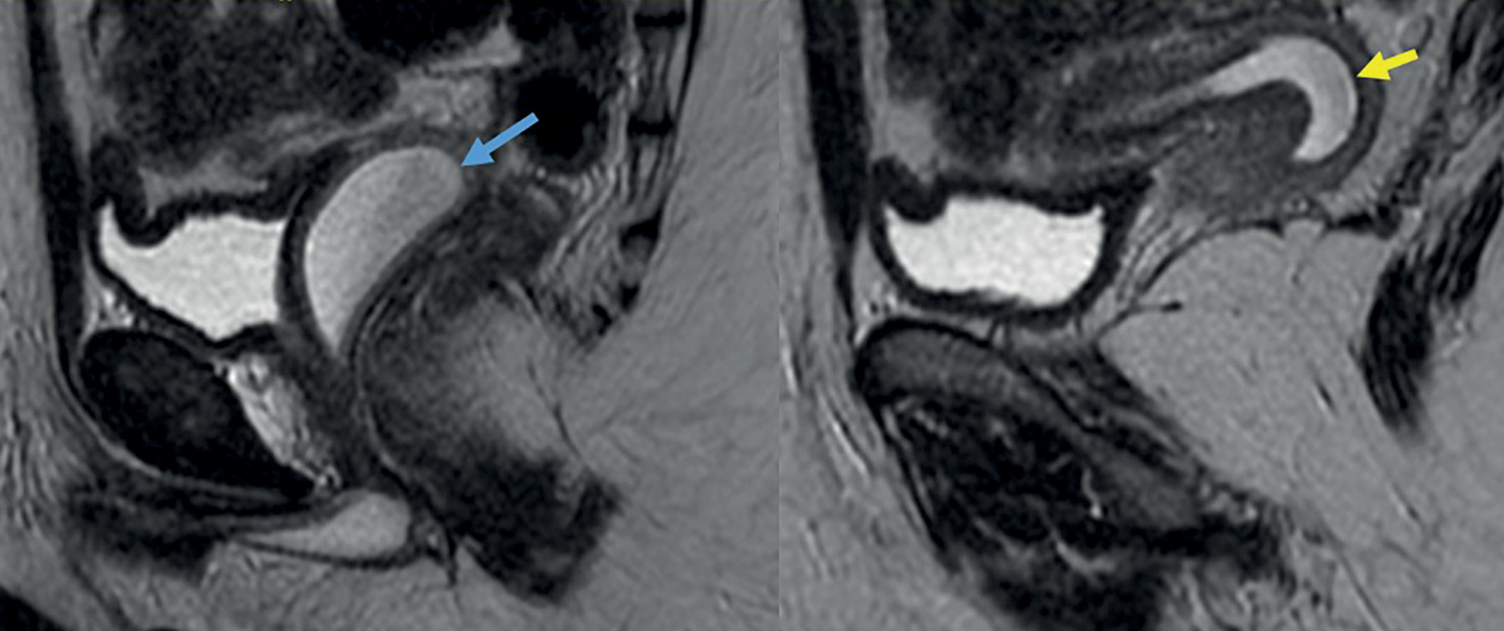 Диагноз поставлен при рождении на основании высокого уровня 17-гидроксипрогестерона, женского кариотипа и вирилизации наружных половых органов 5-й степени. В раннем возрасте выполнены пластика гипертрофированного клитора и синусотомия. В возрасте 12 лет в связи с макрогематурией выявлены признаки гематокольпоса (синяя стрелка) и гематометры (желтая стрелка), подтвержденные МРТ-исследованием. Благодаря оперативным действиям эндокринологов по месту жительства и родителей девочку оперативно госпитализировали и прооперировали в институте эндокринологии. В связи с высокой формой уретро-вагинального свища и недостаточной эстрогенизацией и поэтому высоким риском осложнений решено отказаться от разобщающей интроитопластики в пользу проведения синусовагинотомии. Клинический пример демонстрирует неэффективность синусотомии, выполненной в допубертатном периоде, — несмотря на рассечение общего мочеполового канала, было получено осложнение со стороны половых путей в виде гематокольпоса и гематометры, причиной которого был узкий вход во влагалище.