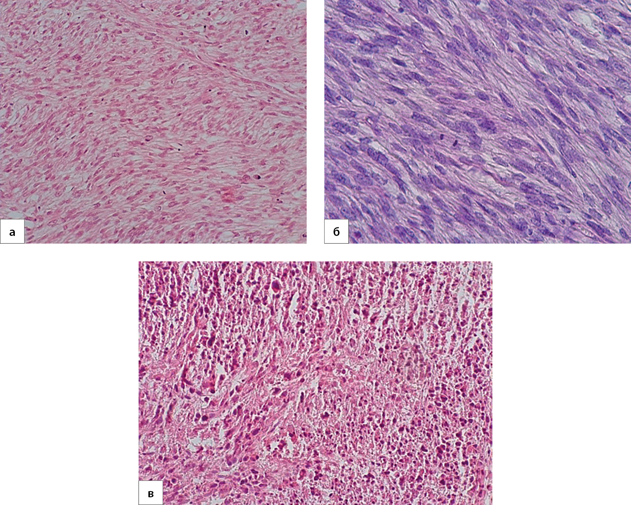 2. Рисунок 2. Лейомиосаркома правого надпочечника: а — веретеновидные клетки с эозинофильной цитоплазмой, формирующие разнонаправленные пучковые структуры (увеличение ×200, окрашивание — гематоксилин-эозин); б — фигуры митозов, в том числе атипичных (увеличение ×400, окрашивание — РАS-реакция); в — очаги некрозов, крупные клетки с уродливыми гиперхромными ядрами (увеличение ×200, окрашивание — гематоксилин-эозин). | |
