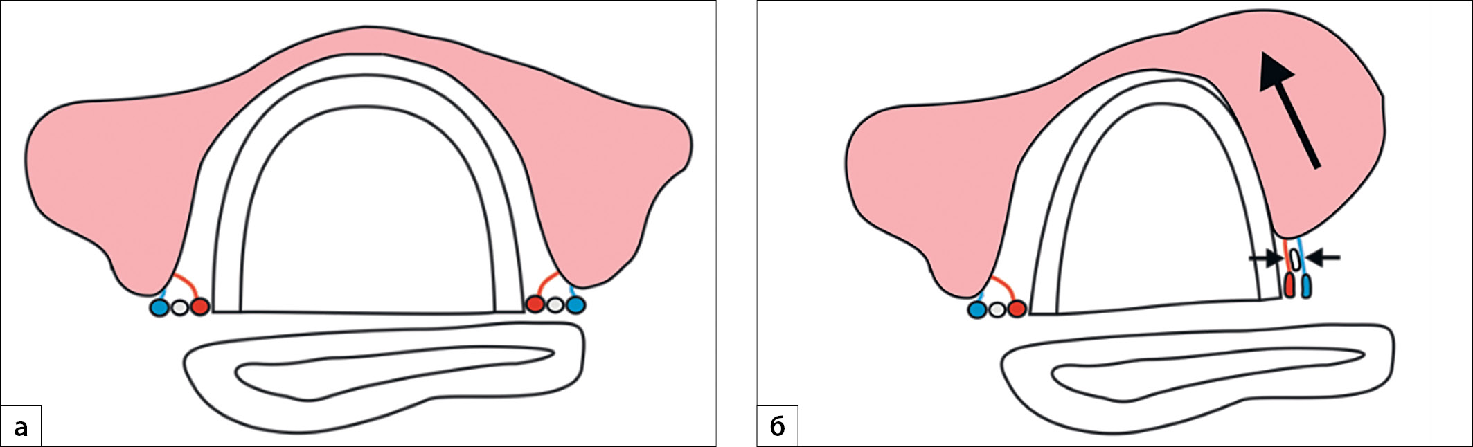 9. Рис. 9. Взаимоотношения нижних щитовидных сосудов и возвратного гортанного нерва: в норме (а) и при тракции доли щитовидной железы в медиальном направлении (б). | |