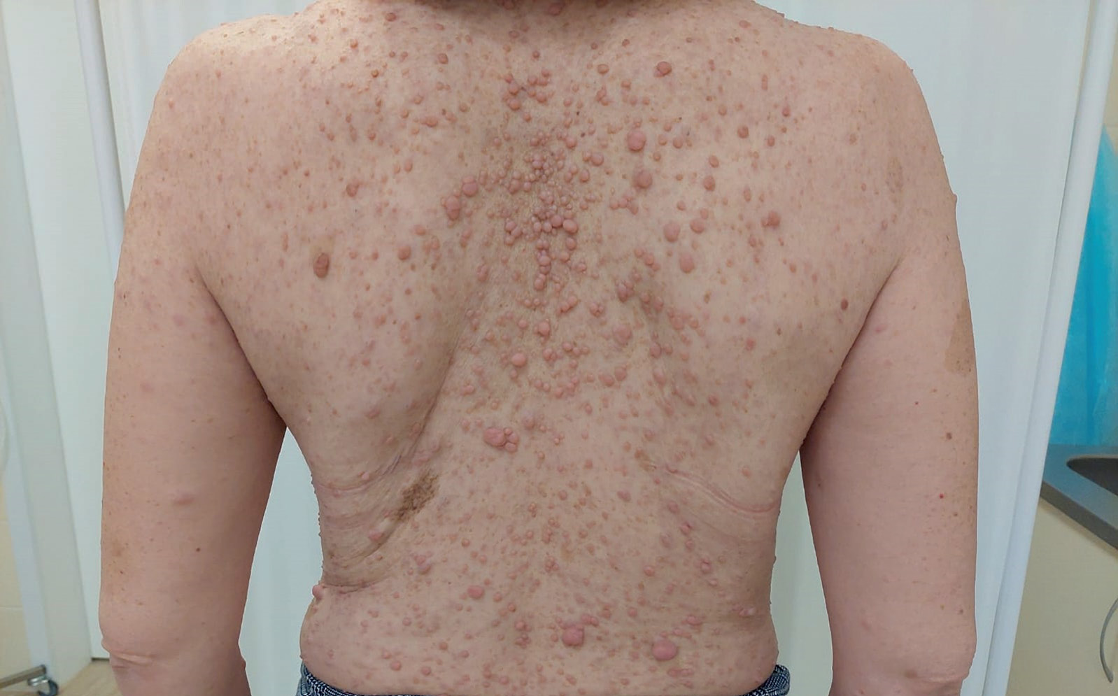 4. Рисунок 4. Нейрофибромы и пятна цвета «кофе с молоком» на спине у пациентки С. | |