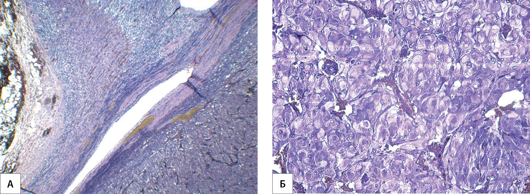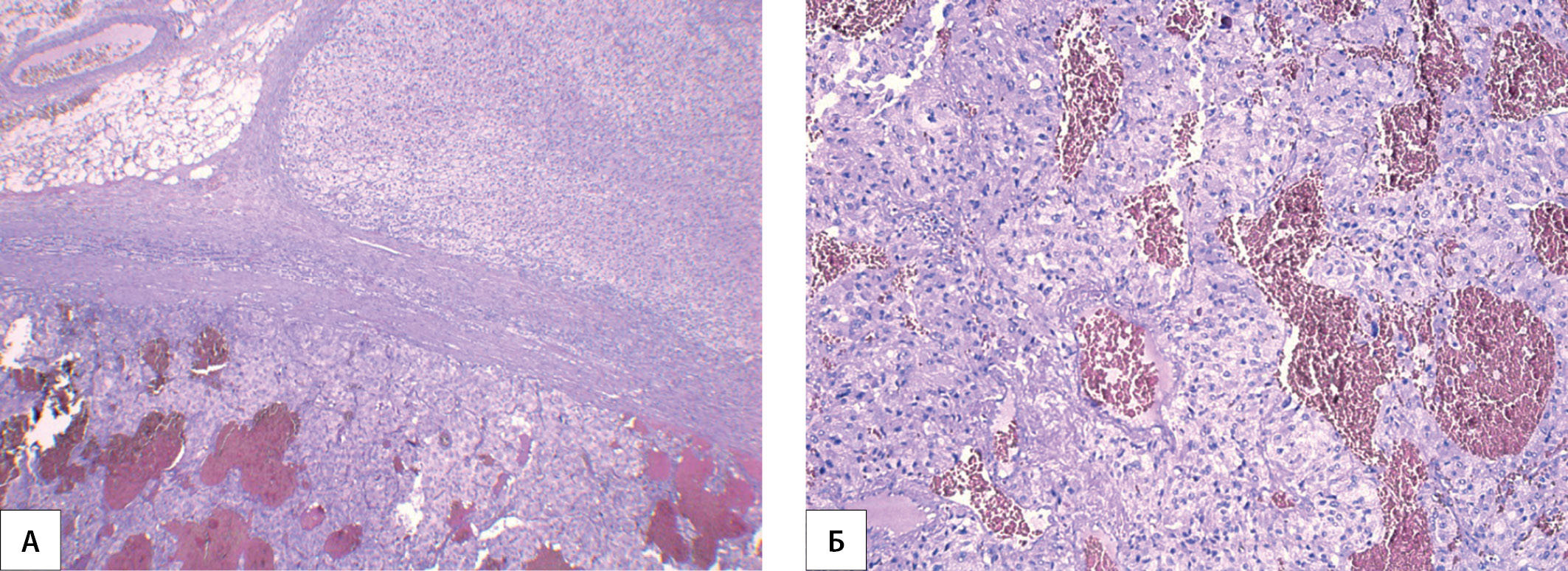 7. Рисунок 7. Гистологическое исследование операционного материала правого надпочечника (гематоксилин-эозин) пациентки С. А — опухоль правого надпочечника, за пределами которой определяется ткань надпочечника с сохранной слоистой структурой (х40); Б — опухоль альвеолярного строения из хромаффинных клеток с кровоизлияниями (х100). | |
