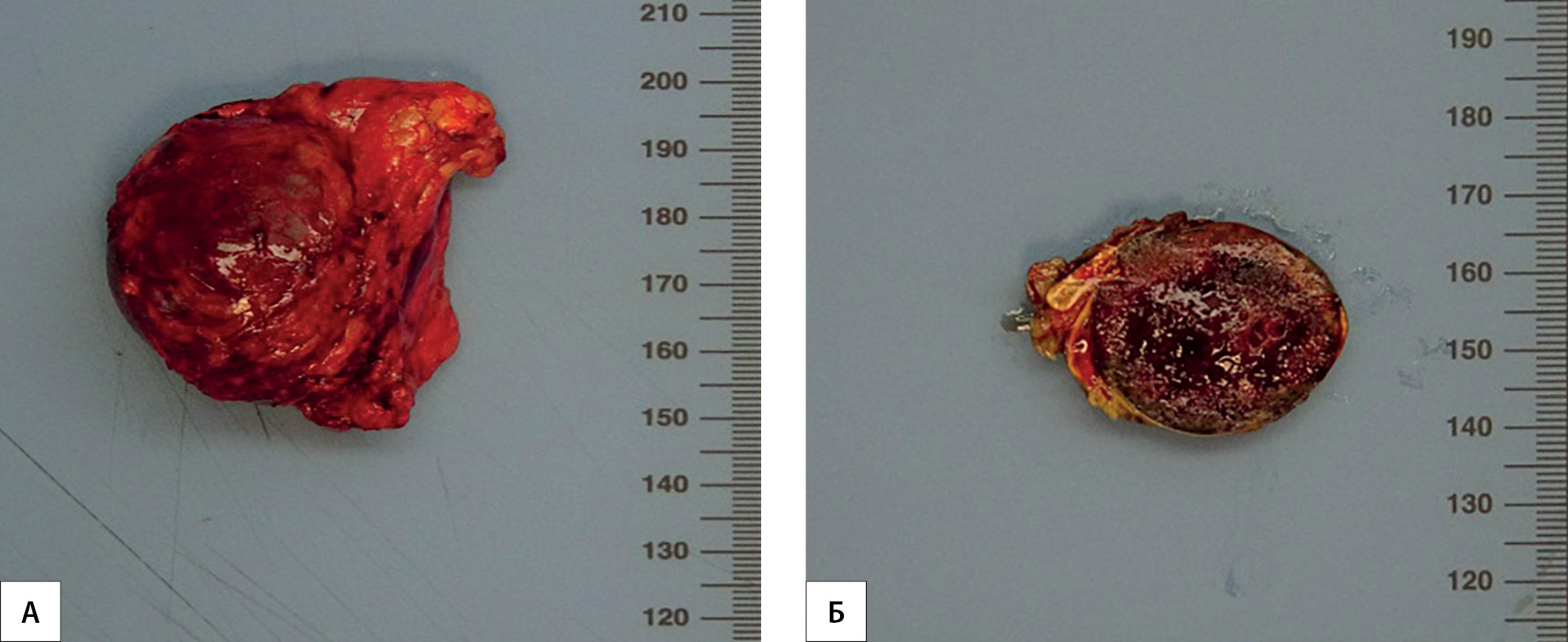 6. Рисунок 6. Макроскопическое исследование ткани правого надпочечника пациентки С.: А — надпочечник с наличием объемного образования; Б — вид на разрезе опухоли красно-коричневого цвета, по периферии которой определяется надпочечник с сохранной слоистой структурой. | |