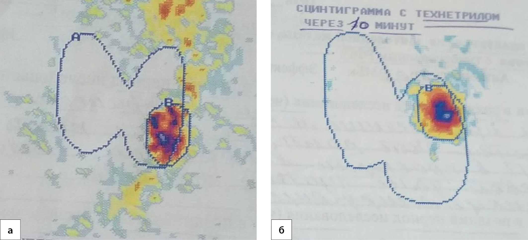 2. Рис. 2. Сцинтиграфия околощитовидных желез с технетрилом: а) аденома нижней левой околощитовидной железы; б) аденома верхней правой околощитовидной железы.