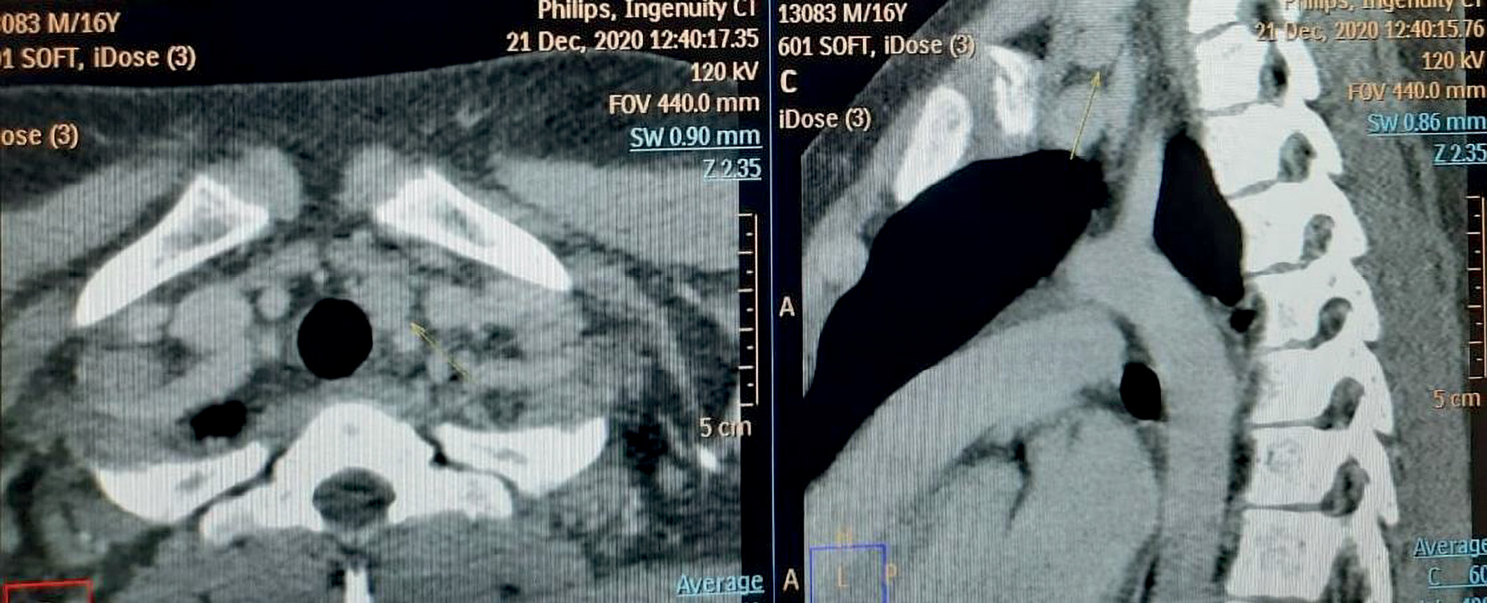 3. Рис. 3. Компьютерная томограмма шеи: стрелкой обозначена аденома околощитовидной железы