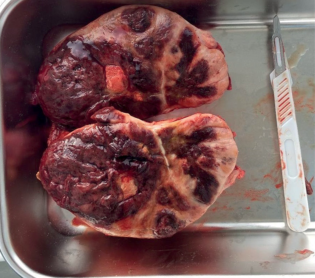 1. Рис. 1. Макропрепарат удаленного надпочечника на разрезе.