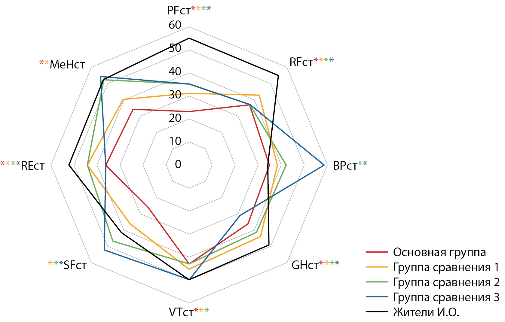 1. Рисунок 1. Стандартизированные показатели КЖ пациентов до хирургического лечения в сравнении с сопоставимой по полу и возрасту выборкой жителей Иркутской области.