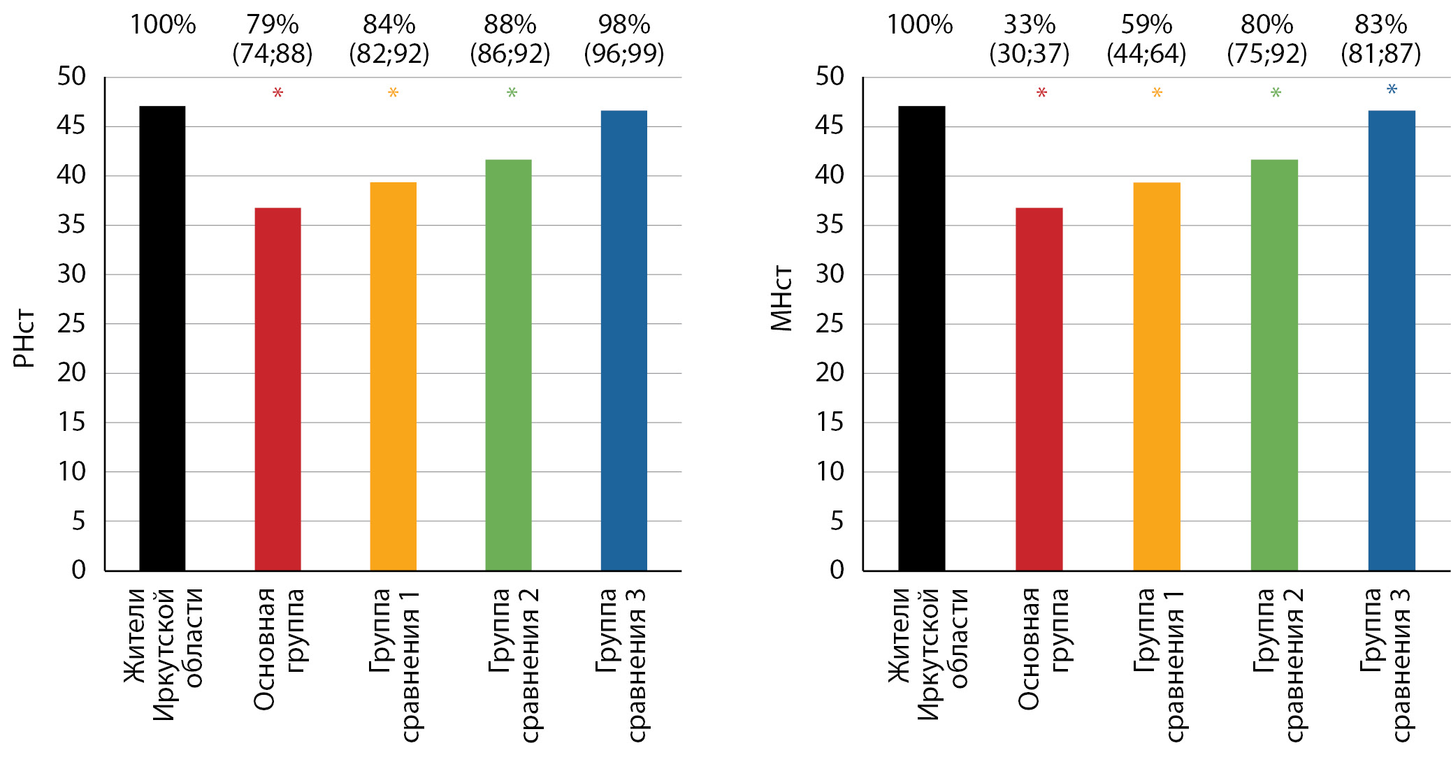 5. Рисунок 5. Физический и психологический компоненты здоровья пациентов в сравнении с сопоставимой по полу и возрасту выборкой жителей Иркутской области.