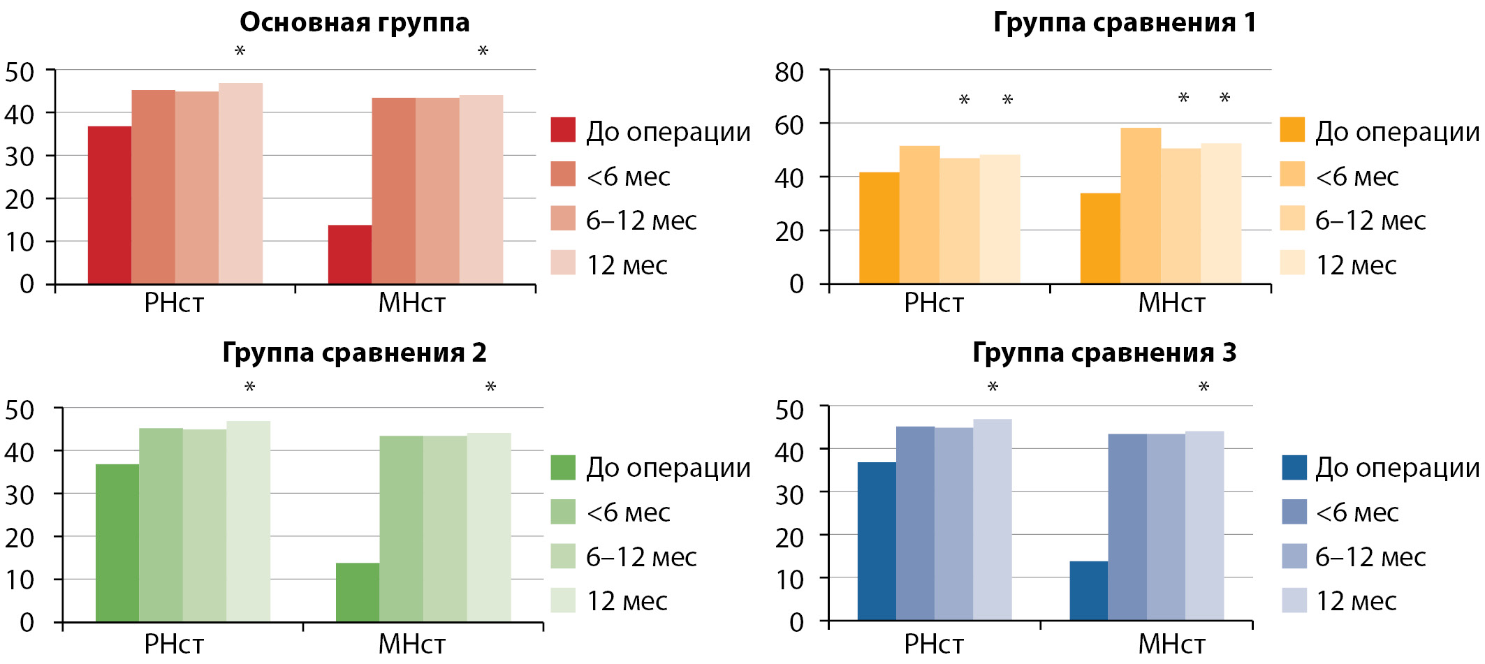 4. Рисунок 4. Физический и психологический компоненты здоровья пациентов после операции в зависимости от исхода и осложнений.