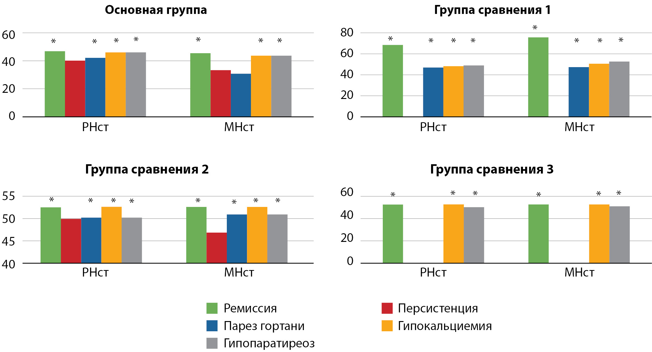 РЕЗУЛЬТАТЫ. В исследование включены 100 пациентов, из которых 13 — с множественным поражением околощитовидных желез (ОЩЖ), 51 — с солитарным поражением при ПГПТ, 34 — с ВГПТ и 2 — с ТГПТ. Показатели КЖ больных ГПТ до операции статистически значимо ниже, чем в целом в регионе. Наибольшее снижение КЖ выявлено в группе пациентов с множественным поражением ОЩЖ при ПГПТ. Улучшение КЖ достигнуто у 90% исследуемых пациентов. Несмотря на выявленные осложнения, установлено улучшение КЖ после операции в случае достижения ремиссии заболевания. Персистенция заболевания — исход, не позволяющий статистически значимо улучшить КЖ после операции при любом виде ГПТ. Ухудшение КЖ по некоторым показателям обнаружено у 10% пациентов. У пациентов с солитарным поражением ОЩЖ при ПГПТ ухудшение КЖ связано с послеоперационной гипокальциемией на фоне синдрома «голодных костей», а у больных с ВГПТ — со снижением уровня ПТГ ниже популяционных показателей.