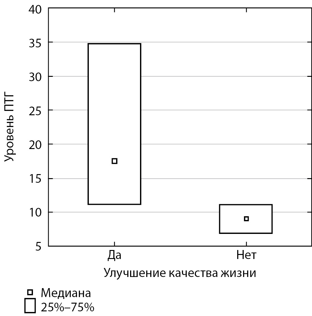 6. Рисунок 6. Зависимость улучшения/ухудшения качества жизни от значения паратиреоидного гормона после операции у пациентов группы сравнения 2 с транзиторной гипокальциемией.