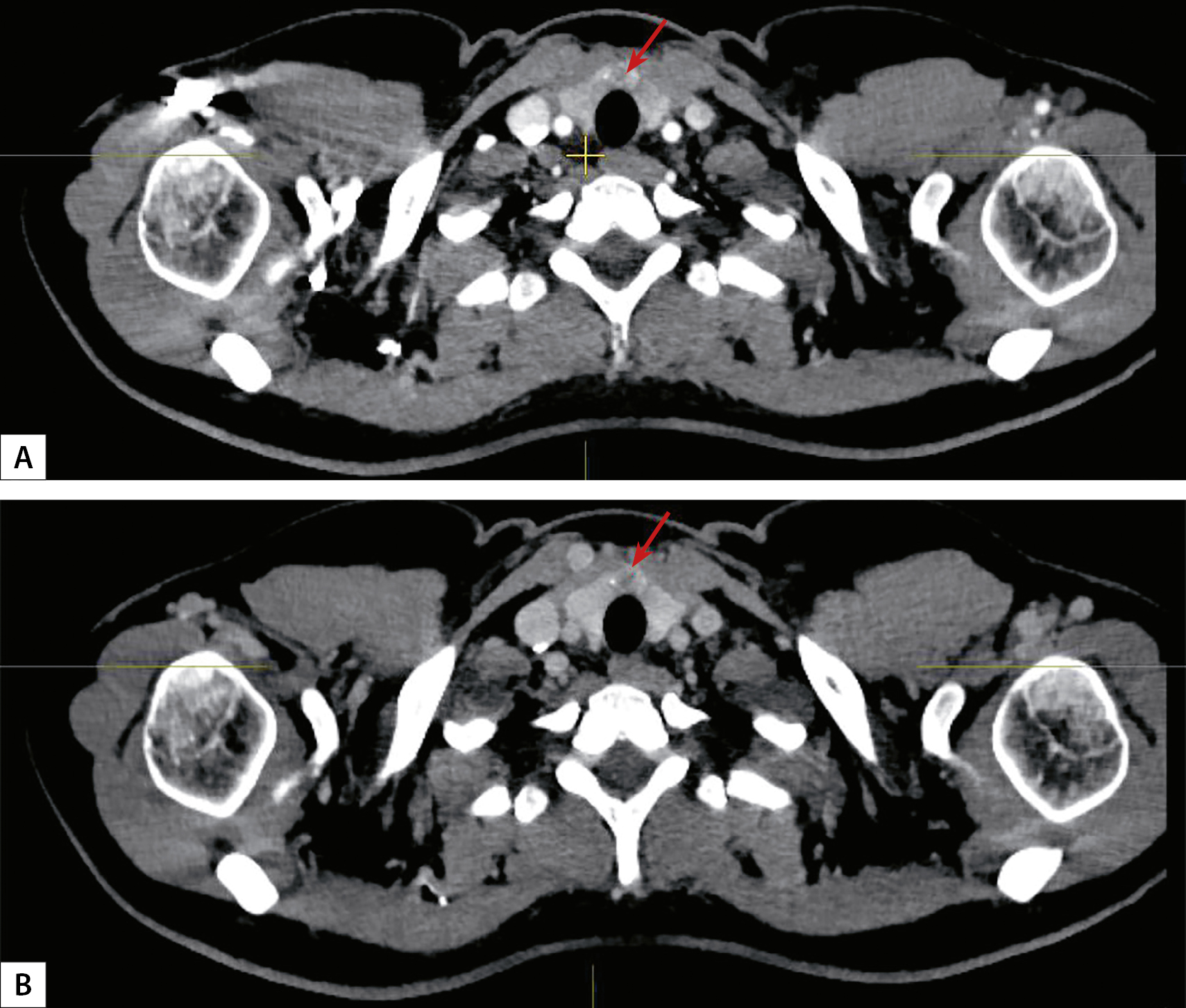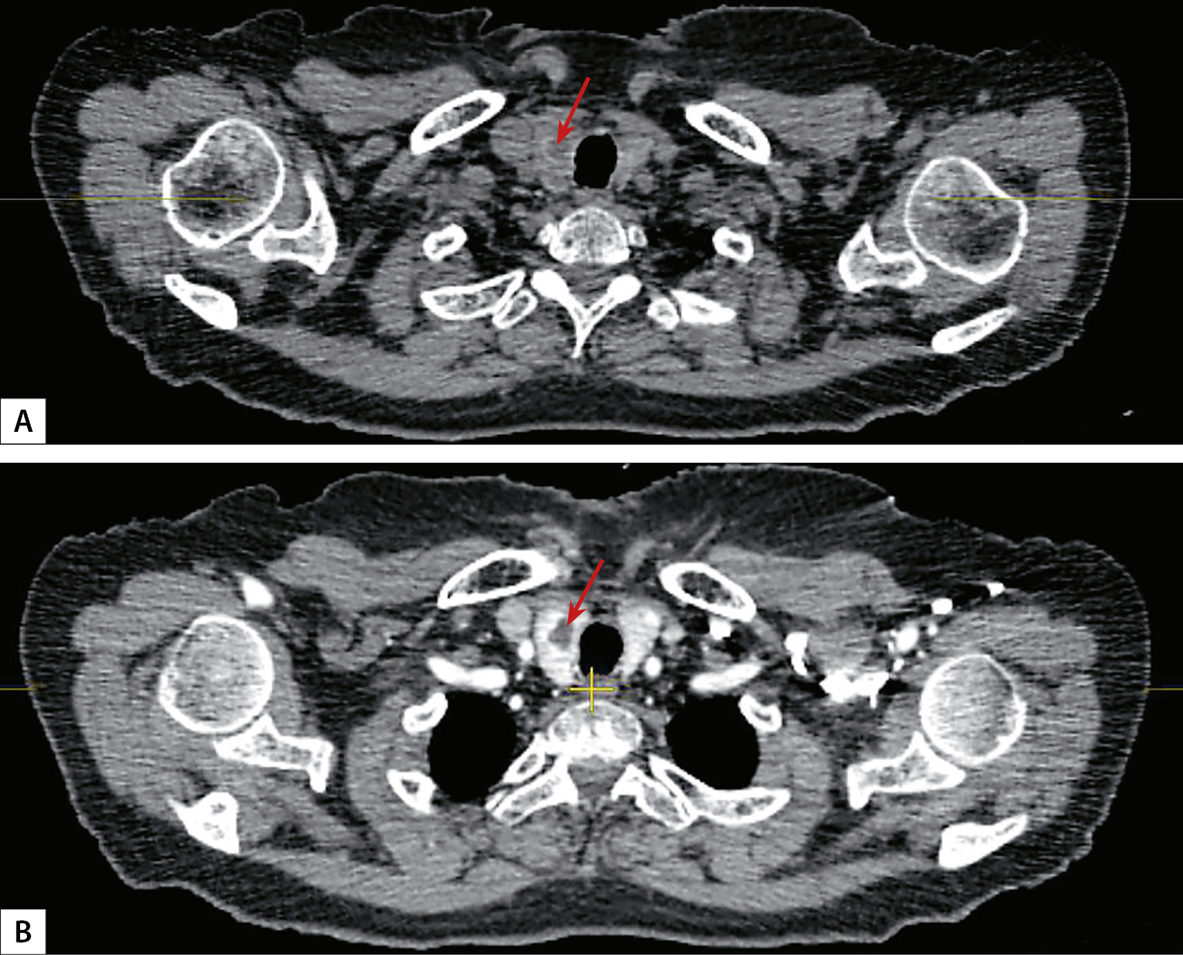 1. Рисунок 1. КТ-картина карциномы щитовидной железы (аксиальный срез, образование указано стрелкой). А — артериальная фаза, В — венозная фаза.