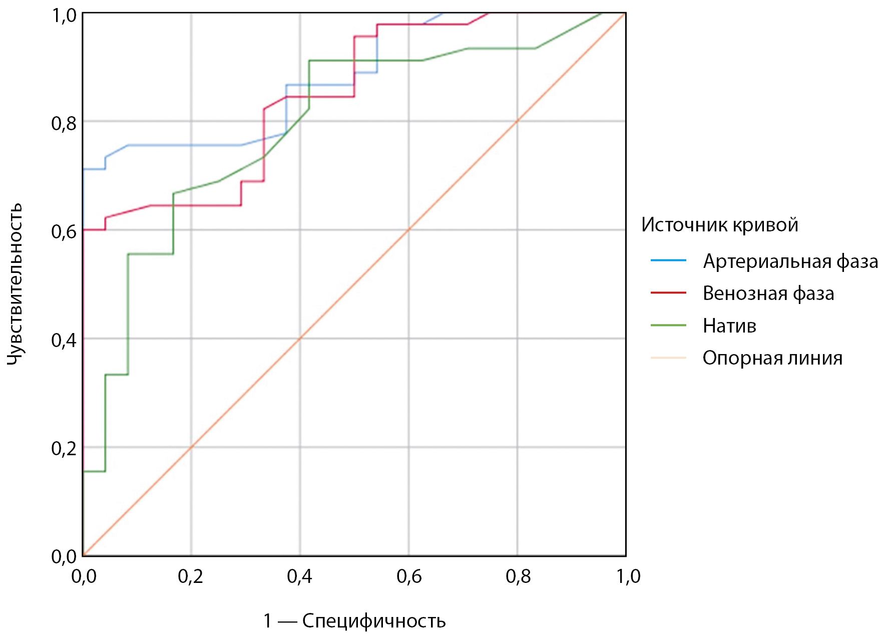 РЕЗУЛЬТАТЫ. В исследование были включены 64 пациента с диагнозом «Фолликулярная аденома щитовидной железы» и 82 пациента с дифференцированным раком ЩЖ. При оценке взаимосвязи между карциномой ЩЖ и плотности образования в единицах Хаунсфилдах выявлена положительная корреляция (корреляция по Спирмену в нативную фазу r=0,48; артериальную фазу r=0,69; венозную фазу r=0,64; p<0,001). Проведен анализ чувствительности и специфичности оценки плотности узловых образований ЩЖ по данным КТ. Наиболее показательные результаты продемонстрированы при анализе КТ в артериальную фазу. При точке отсечения в артериальную фазу 121 единицы Хаунсфилда чувствительность составляла 75,6%, а специфичность — 91,7%. При использовании точки отсечения 113 единиц Хаунсфилда в венозную фазу чувствительность составляла 62,2% и специфичность — 95,8%. В нативную фазу точка отсечения 49 единиц Хаунсфилда продемонстрировала чувствительность 68,9% и специфичность — 75%.