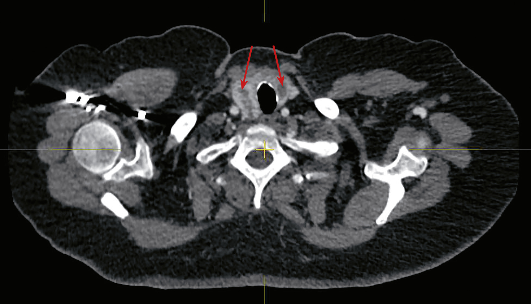 5. Рисунок 5. КТ-картина множественных образований обеих долей щитовидной железы (аксиальный срез, образование указано стрелкой).